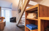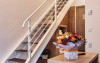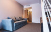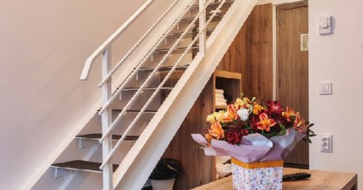 Apartamentul family este de asemenea dispus pe doua niveluri: la parter living cu canapea extensibila si la etaj doua camere cu pat matrimonial. Exista o singura baie situata la parter.