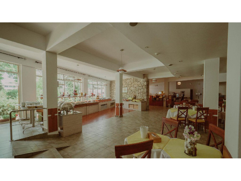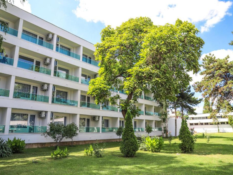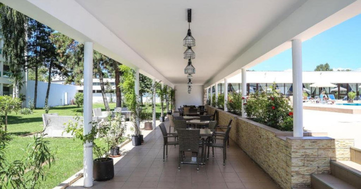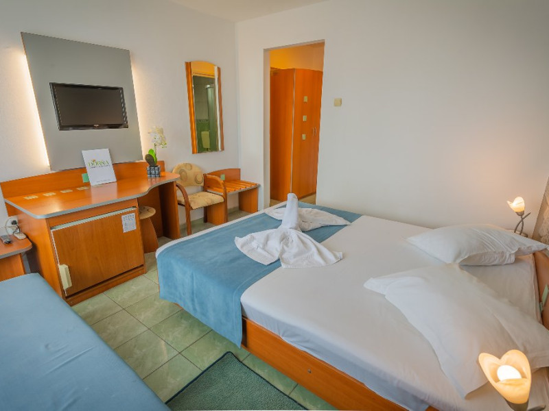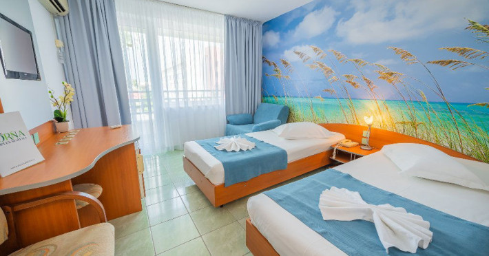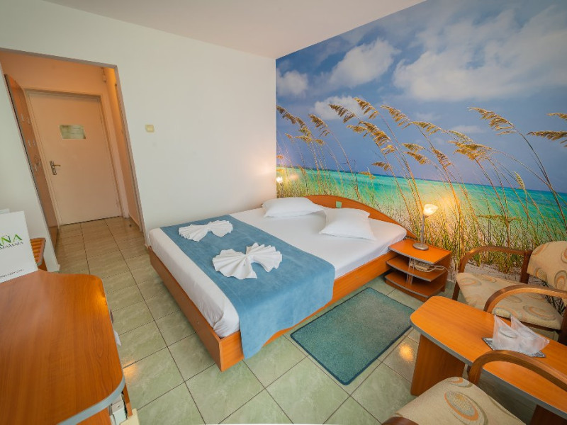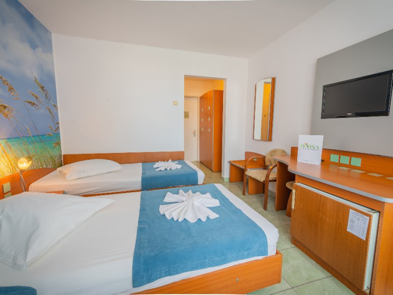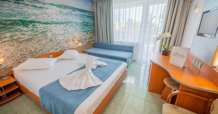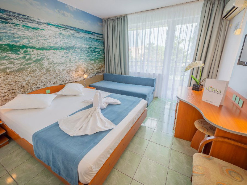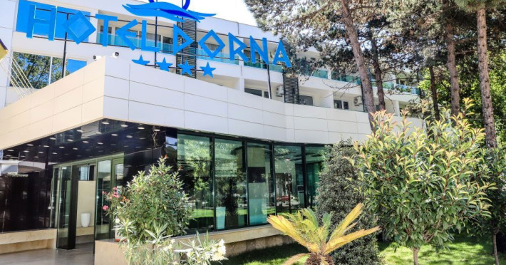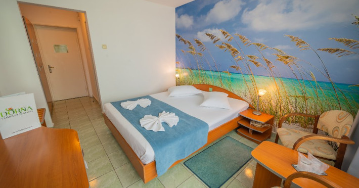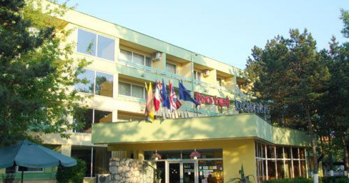 INFORMATII GENERALE Situat in nordul statiunii Mamaia, in zona verde, la 200m de apa marii, hotelul Dorna are o pozitie privilegiata cu vedere spre lacul Siutghiol si spre Marea Neagra. In imediata vecinatate a hotelului se afla terenuri de minigolf si tenis si un spatios loc de joaca pentru copii. Turistii beneficiaza pentru fiecare camera: 2 sezlonguri, umbrela pe plaja privata a hotelului FACILITATI UNITATE Dotari generale: restaurant, parcare publica -gratuita in limita disponibilitatilor, loc de joaca pentru copii, internet -wireless gratuit, pastrare obiecte de valoare, 3 nivele, bar. Hotelul dispune de plaja proprie (sezlongurile si umbrele de pe plaja sunt gratuite). Fitness/Wellness/Sport: Acces gratuit la piscina in aer liber pentru adulti si copii. Complexul ofera clientilor (gratuit - in limita disponibilitatilor): sezlonguri; umbrele si saltelute. Nu se poate face rezervare de sezlong. DESCRIERE CAMERE Camere cu balcon cu vedere la Marea Neagra sau la Lacul Siutghiol. Camerele Hotelului Dorna au aer condiionat, TV prin cablu, minibar i birou. Este disponibil acces gratuit la internet WiFi. LOCALIZARE Hotelul Dorna este situat la 200 de metri de plaja Ipanera din staiunea Mamaia, in nordul statiunii Mamaia. Plaja: larga, nisipoasa cu intrare lina in mare. SERVICII MASA Restaurantul Petit Jardin serveste o gama larga de mancaruri romanesti si internationale atat in interior, cat si pe terasa spatioasa. De asemenea, oaspetii pot savura o bautura langa piscina, pe terasa umbrita. Micul dejun este servit sub forma de bufet suedez. FACILITATI COPII 1 copil cu varsta 0-12 ani beneficiaza de cazare si mic dejun gartuit, in camera cu parintii.Datorita dinamicitatii domeniului disponibilitatea ofertelor se modifica de la un moment la altul. De aceea ofertele sunt valabile in limita locurilor disponibile. Agentia nu este responsabila pentru eventualele neconcordante care pot aparea intre informatiile privind tarifele si alte detalii din site si informatiile primite in agentie. In aceste cazuri vor avea prioritate, intotdeauna, informatiile primite in agentie.