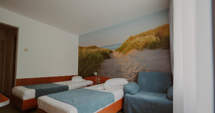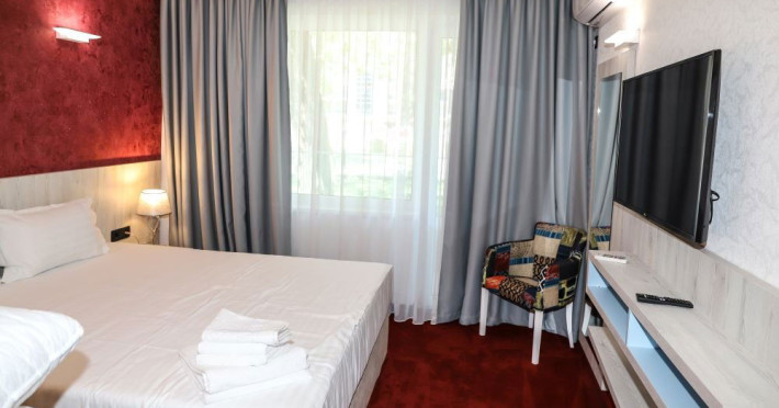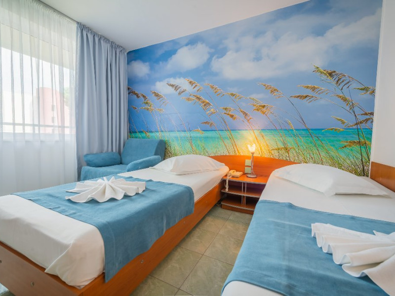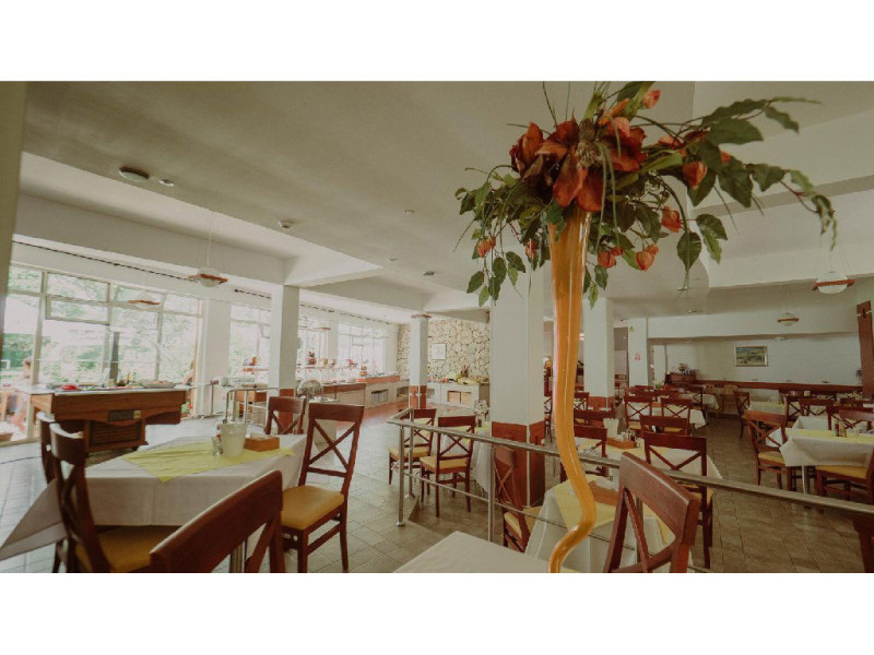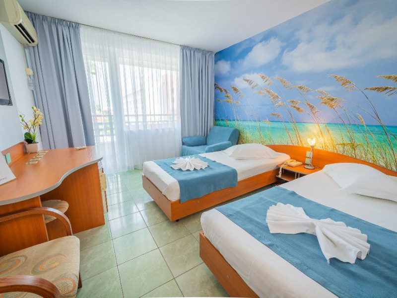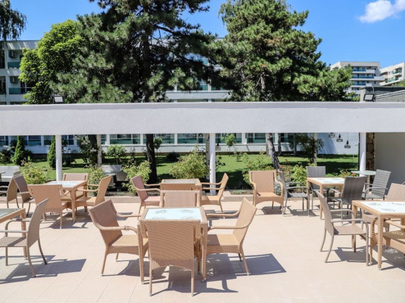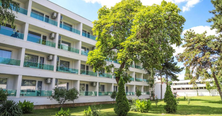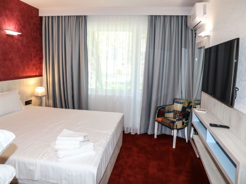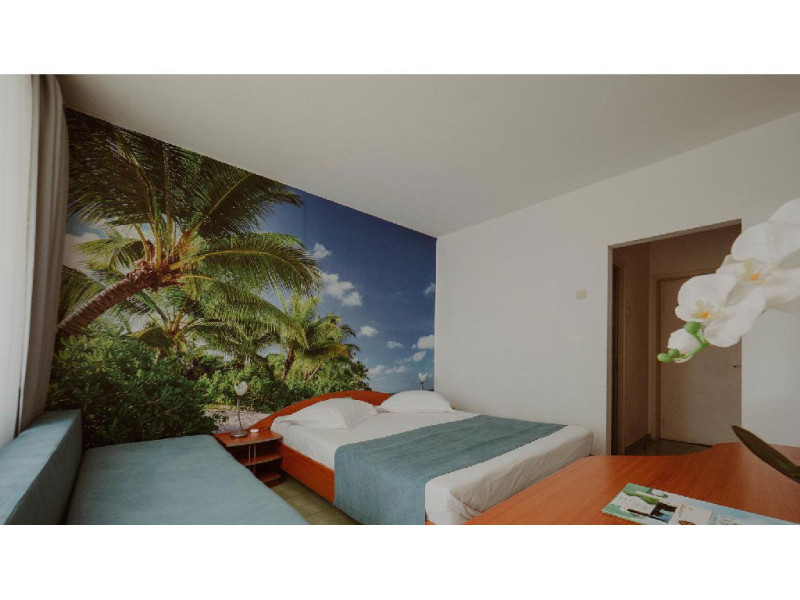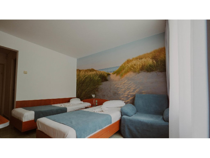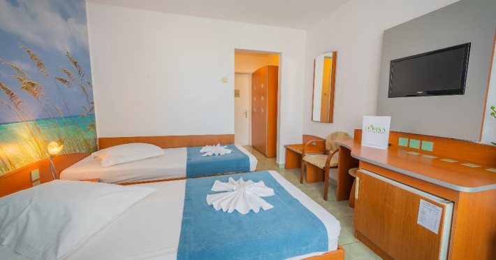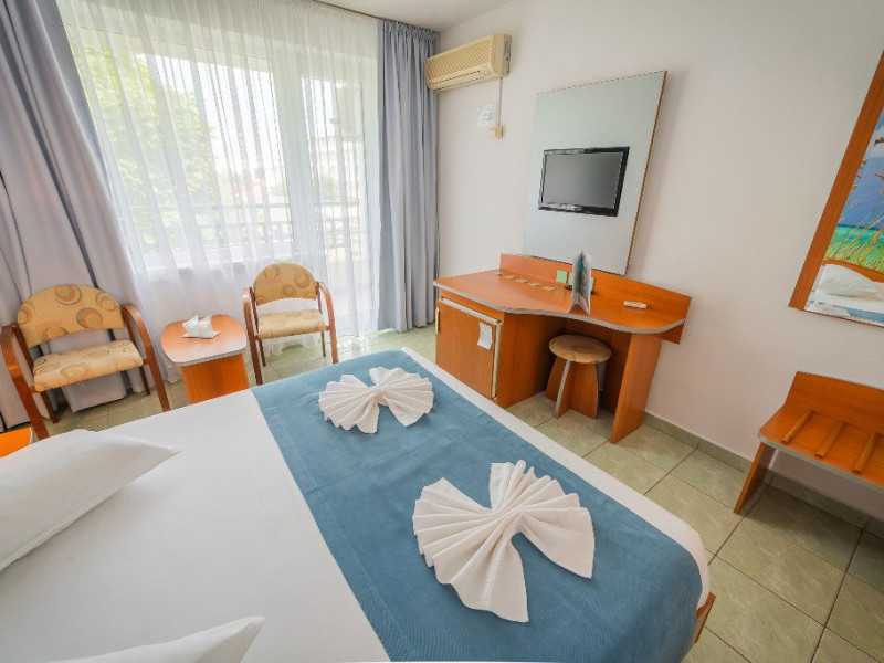 INFORMATII GENERALE Situat in nordul statiunii Mamaia, in zona verde, la 200m de apa marii, hotelul Dorna are o pozitie privilegiata cu vedere spre lacul Siutghiol si spre Marea Neagra. In imediata vecinatate a hotelului se afla terenuri de minigolf si tenis si un spatios loc de joaca pentru copii. Turistii beneficiaza pentru fiecare camera: 2 sezlonguri, umbrela pe plaja privata a hotelului FACILITATI UNITATE Dotari generale: restaurant, parcare publica -gratuita in limita disponibilitatilor, loc de joaca pentru copii, internet -wireless gratuit, pastrare obiecte de valoare, 3 nivele, bar. Hotelul dispune de plaja proprie (sezlongurile si umbrele de pe plaja sunt gratuite). Fitness/Wellness/Sport: Acces gratuit la piscina in aer liber pentru adulti si copii. Complexul ofera clientilor (gratuit - in limita disponibilitatilor): sezlonguri; umbrele si saltelute. Nu se poate face rezervare de sezlong. DESCRIERE CAMERE Camere cu balcon cu vedere la Marea Neagra sau la Lacul Siutghiol. Camerele Hotelului Dorna au aer condiionat, TV prin cablu, minibar i birou. Este disponibil acces gratuit la internet WiFi. LOCALIZARE Hotelul Dorna este situat la 200 de metri de plaja Ipanera din staiunea Mamaia, in nordul statiunii Mamaia. Plaja: larga, nisipoasa cu intrare lina in mare. SERVICII MASA Restaurantul Petit Jardin serveste o gama larga de mancaruri romanesti si internationale atat in interior, cat si pe terasa spatioasa. De asemenea, oaspetii pot savura o bautura langa piscina, pe terasa umbrita. Micul dejun este servit sub forma de bufet suedez. FACILITATI COPII 1 copil cu varsta 0-12 ani beneficiaza de cazare si mic dejun gartuit, in camera cu parintii.Datorita dinamicitatii domeniului disponibilitatea ofertelor se modifica de la un moment la altul. De aceea ofertele sunt valabile in limita locurilor disponibile. Agentia nu este responsabila pentru eventualele neconcordante care pot aparea intre informatiile privind tarifele si alte detalii din site si informatiile primite in agentie. In aceste cazuri vor avea prioritate, intotdeauna, informatiile primite in agentie.