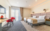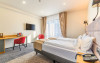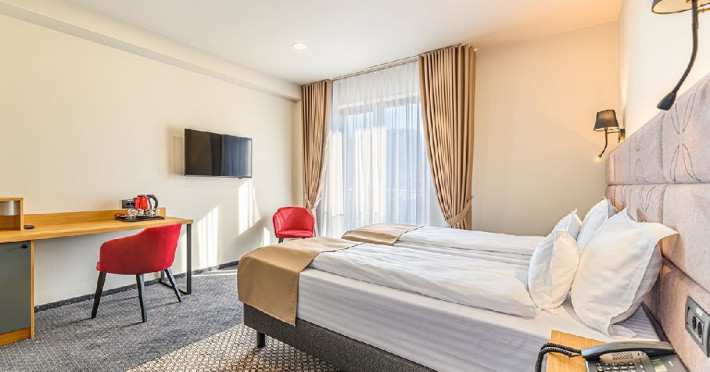 Camera dubla Executive Matrimoniala are o suprafata de 28 m2 toate cu aer conditionat, dotate cu baie cu dus, uscator de par, minibar, telefon si TV LCD, halat de baie, fierbator, papuci, fotoliu extensibil. Dimensiune pat: 180 cm x 200 cm.