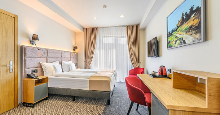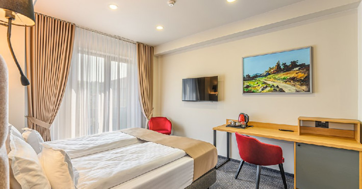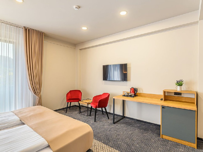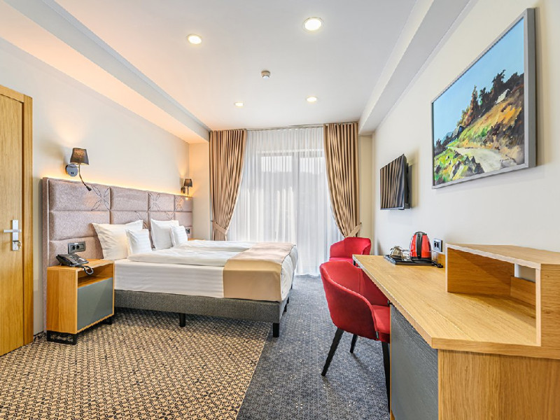 Camera dubla Superiora Matrimoniala are o suprafata de 26 m2 toate cu aer conditionat, dotate cu baie cu dus, uscator de par, minibar, telefon si TV LCD, halat de baie, fierbator, papuci. Dimensiune pat: 180 cm x 200 cm.