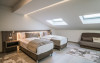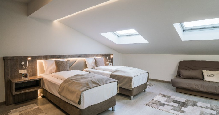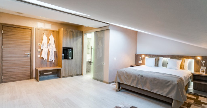 Suprafata: 30-35 mp, etaj 4. Camerele sunt echipate cu baie cu dus, WC, minibar, cafetiera, TV Led 80-104 cm, televiziune digitala 200 canale, internet de mare viteza, control acces, climatizare si iluminat inteligent. Camerele sunt dotate cu pat 180200 cm (2 paturi 90200 cm), saltea ergonomica 30 cm, perne antialergice, lenjerie premium, halate de baie, pardoseala parchet ecologic, balcon S-E 5 mp cu vedere panoramica Masivul Rarau.