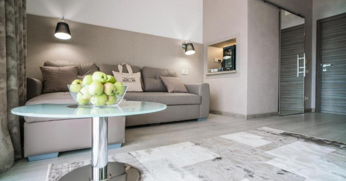 Suprafata: 50 mp, 2 camere (living si dormitor) etaj 2,3,4. Apartamentele sunt echipate cu dressing, baie cu cada (dus), WC, bidet, minibar, cafetiera, TV Led 108-140 cm, televiziune digitala 200 canale, internet de mare viteza, control acces, climatizare si iluminat inteligent. Camerele sunt dotate cu pat 180200 cm si canapea extensibila, saltea ergonomica 30 cm, perne antialergice, lenjerie premium, halate de baie, pardoseala parchet ecologic, balcon S-E 18 mp cu vedere panoramica spre Masivul Rarau.