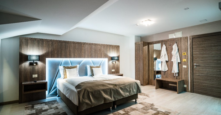 Suprafata: 42 mp, etaj 2,3. Camerele sunt echipate cu dressing, baie cu cada, WC, bidet, minibar, cafetiera, TV Led 140 cm, televiziune digitala 200 canale, internet de mare viteza, control acces, climatizare si iluminat inteligent. Camerele sunt dotate cu 2 paturi 160200 cm , saltea ergonomica 30 cm, perne antialergice, lenjerie premium, halate de baie, pardoseala parchet ecologic, balcon S-E 9 mp cu vedere panoramica spre Masivul Rarau.