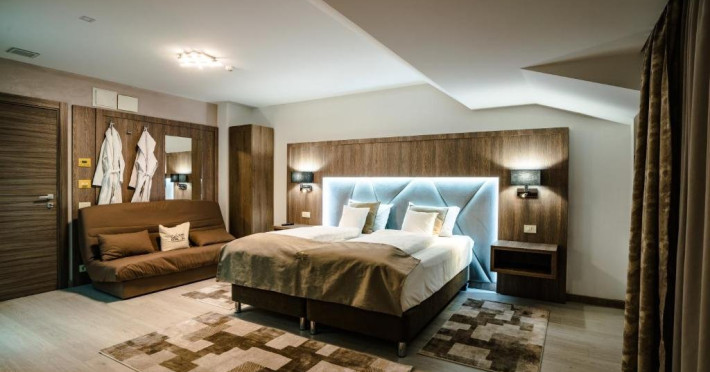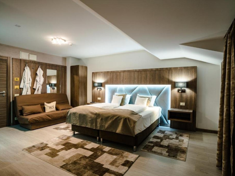 Suprafata: 30-35 mp, etaj 4. Camerele sunt echipate cu baie cu dus, WC, minibar, cafetiera, TV Led 80-104 cm, televiziune digitala 200 canale, internet de mare viteza, control acces, climatizare si iluminat inteligent. Camerele sunt dotate cu pat 180200 cm (2 paturi 90200 cm), saltea ergonomica 30 cm, perne antialergice, lenjerie premium, halate de baie, pardoseala parchet ecologic, balcon S-E 5 mp cu vedere panoramica Masivul Rarau.