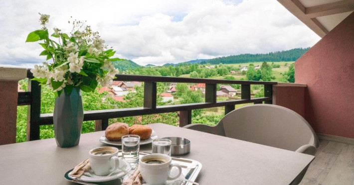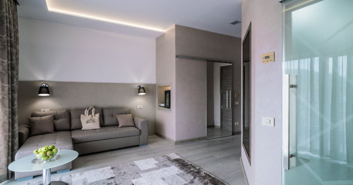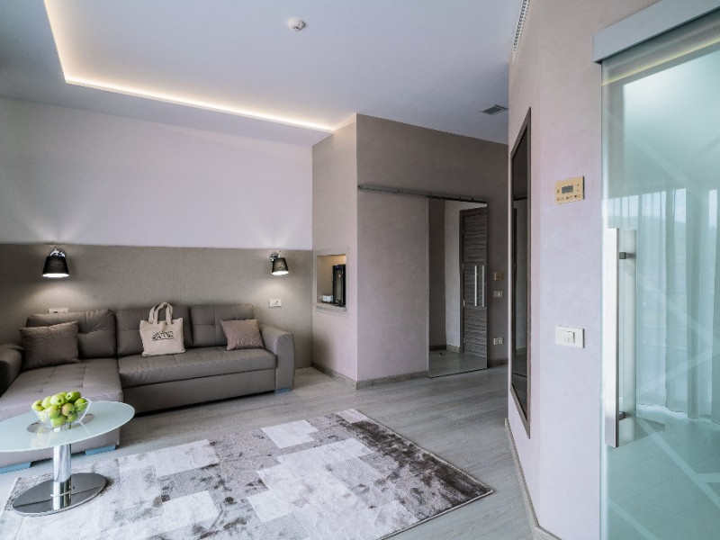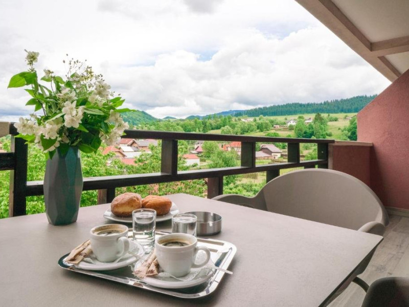 Suprafata: 50 mp, 2 camere (living si dormitor) etaj 2,3,4. Apartamentele sunt echipate cu dressing, baie cu cada (dus), WC, bidet, minibar, cafetiera, TV Led 108-140 cm, televiziune digitala 200 canale, internet de mare viteza, control acces, climatizare si iluminat inteligent. Camerele sunt dotate cu pat 180200 cm si canapea extensibila, saltea ergonomica 30 cm, perne antialergice, lenjerie premium, halate de baie, pardoseala parchet ecologic, balcon S-E 18 mp cu vedere panoramica spre Masivul Rarau.