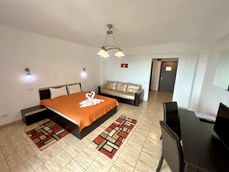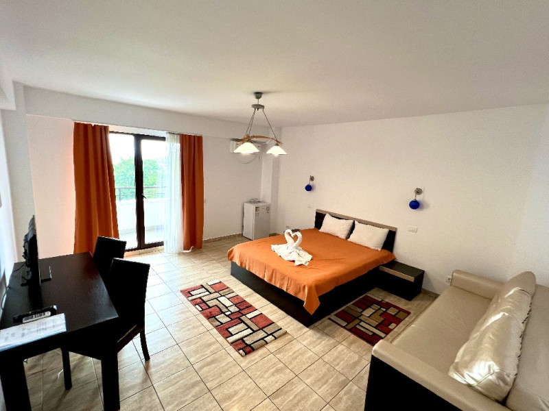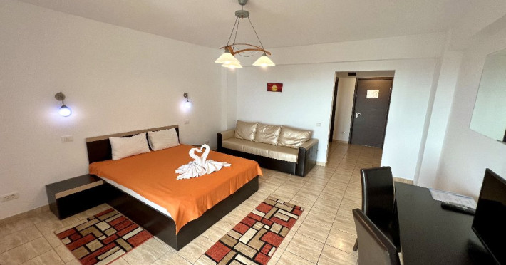 Apartamentul Standard: 1 dormitor cu pat matrimonial, living cu canapea extensibila (de 2 locuri). Camera de aproximativ 50 mp, aer conditionat, TV, frigider, wifi, baie proprie, terasa cu vedere la mare, cu scaune si masa.