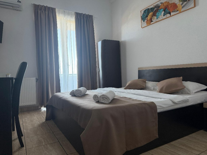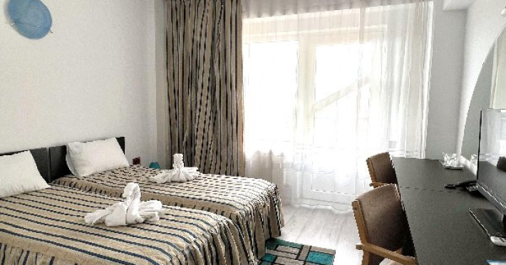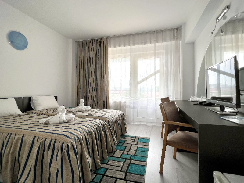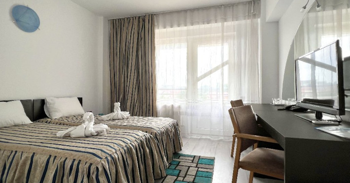 Dubla Standard: 2 paturi twin, 19 mp, aer conditionat, TV, frigider, wifi, baie proprie, balcon, masa si scaune pentru balcon. Camerele au vedere mare/ vedere piscina.