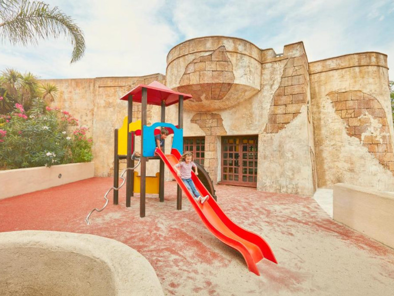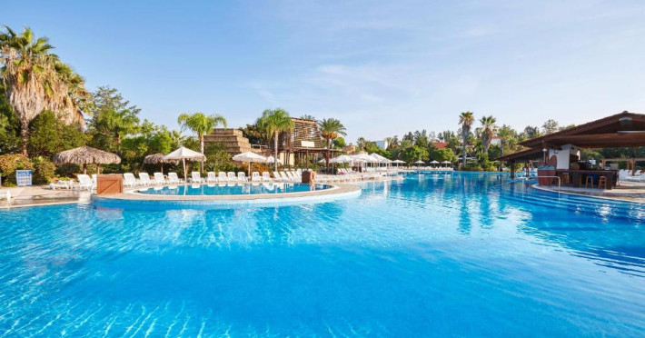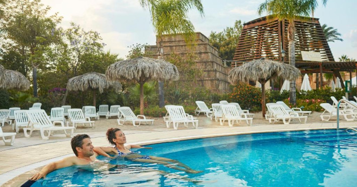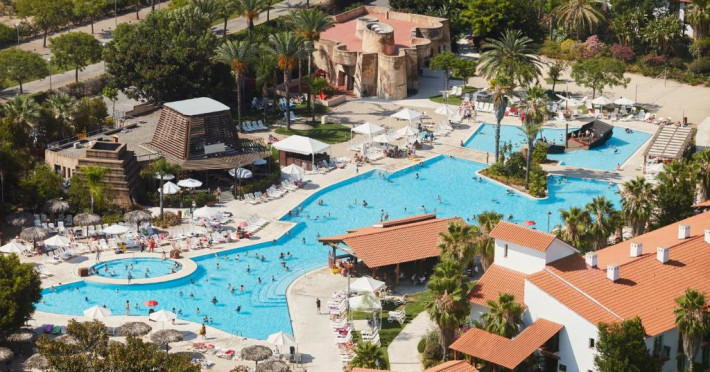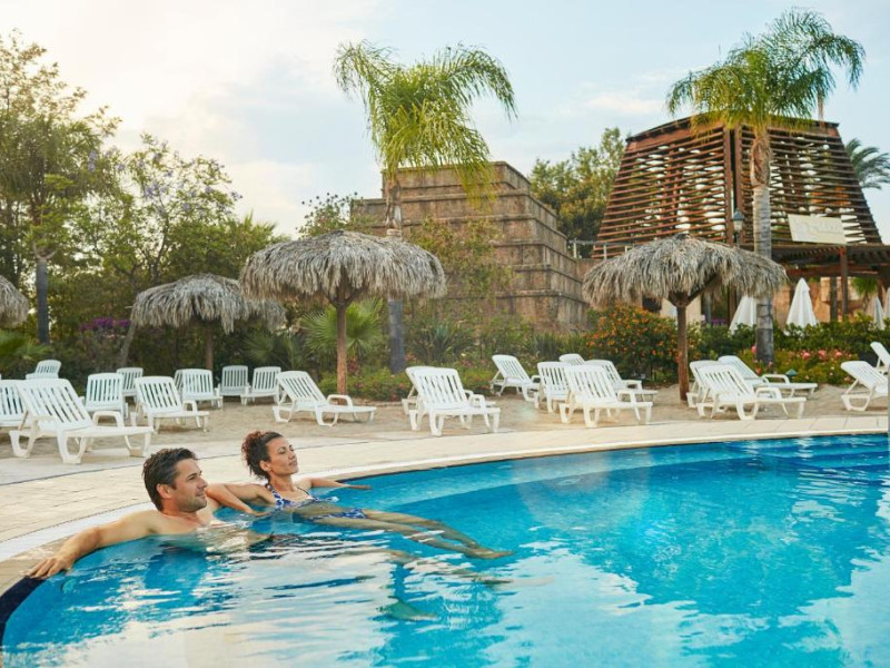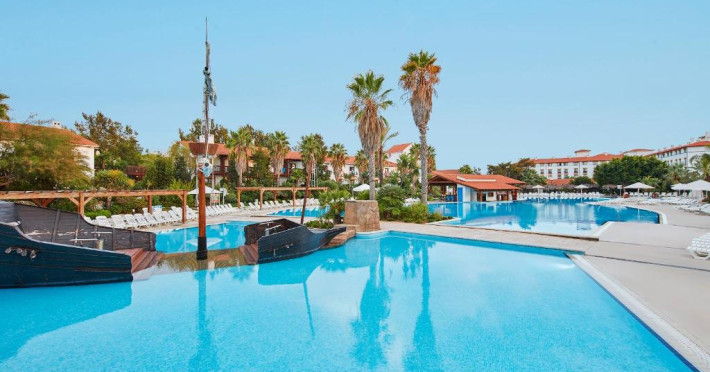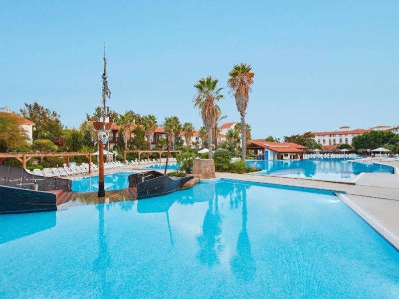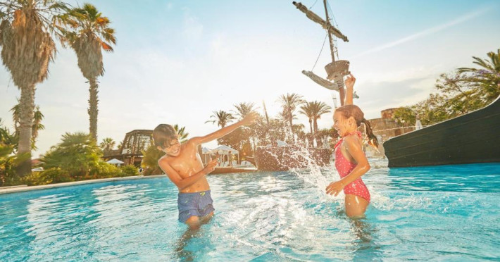 Piscina in aer liber are șezlonguri și o navă de pirați scufundată in mijloc. Există și piscine pentru copii.