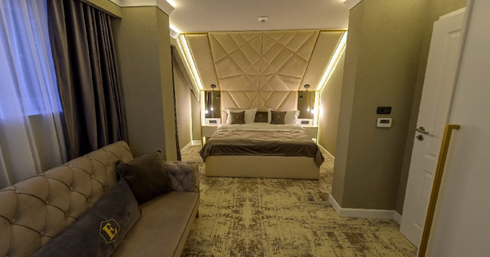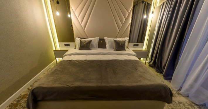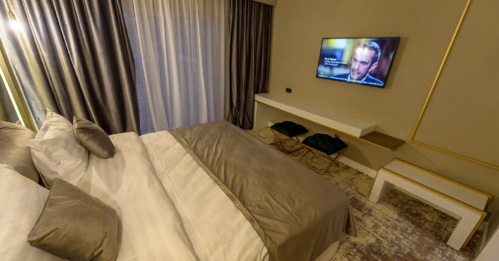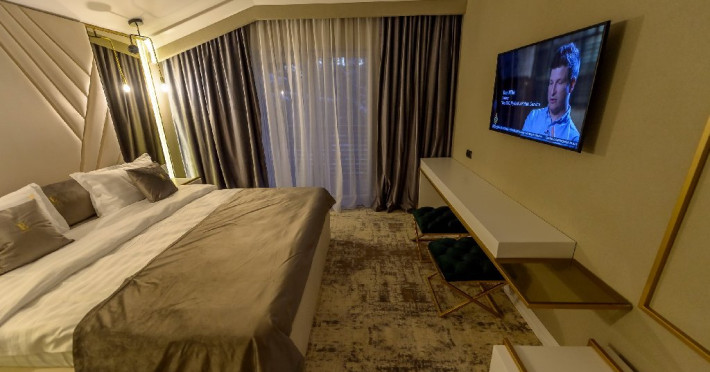 Apartament deluxe: Apartamentul are o suprafata de 34 mp si este format din dormitor cu pat matrimonial + living cu canapea extensibila. Dotari: aer conditionat, acces card, TV lcd, seif, fierbator de apa, acces internet, parchet / mocheta, grup sanitar propriu (dus), halat, papuci, uscator de par, balcon.
