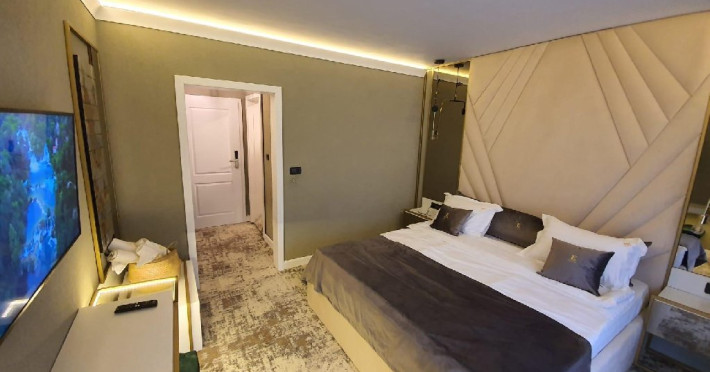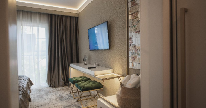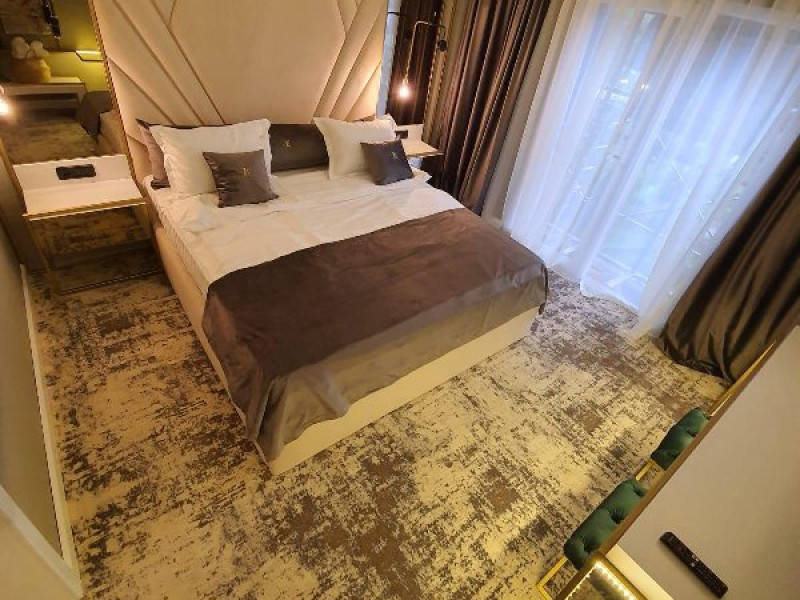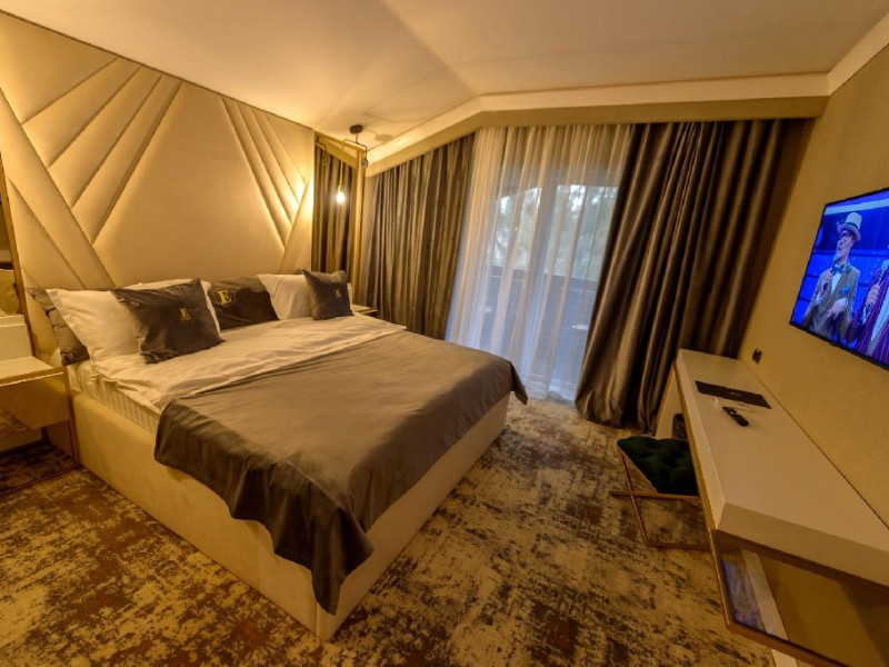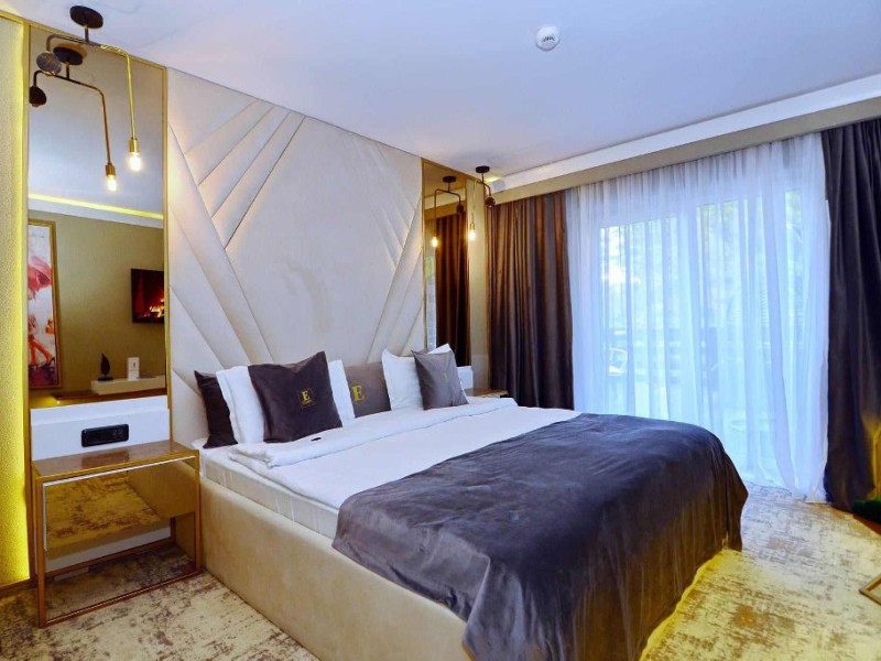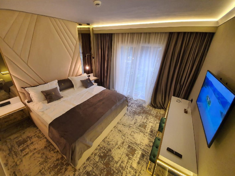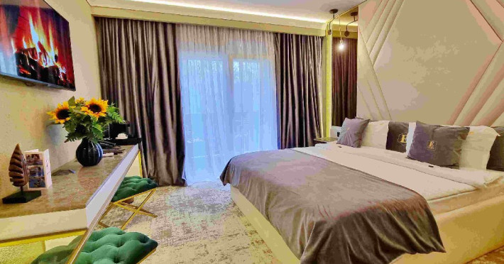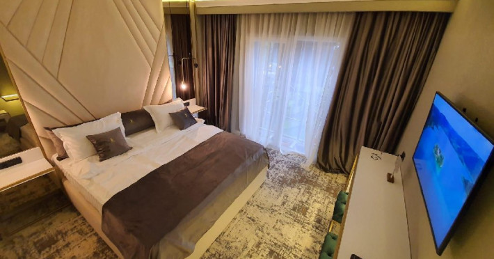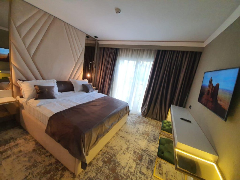 Apartament Deluxe: aer conditionat, acces card, TV lcd, uscator de par, telefon, seif, halat, papuci, fierbator de apa, consumabile, dormitor cu pat matrimonial + living cu canapea extensibila, balcon.