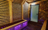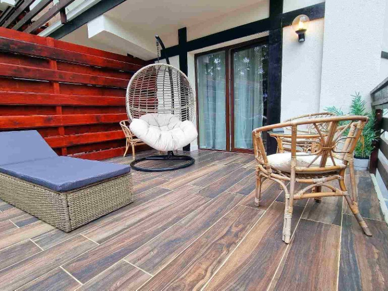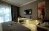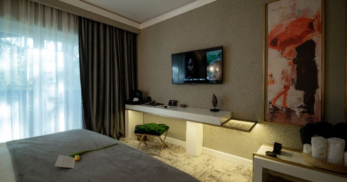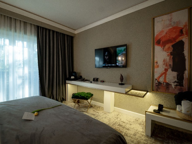 Camera Dubla Garden: aer conditionat, acces card, TV lcd, uscator de par,telefon, seif, halat, papuci, fierbator de apa, consumabile, terasa cu gradina proprie.
