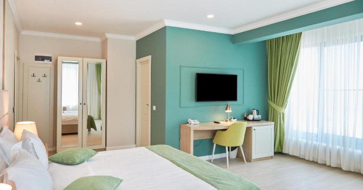 Facilități cameră dublă: pat matrimonial sau twin, baie proprie cu cadă sau duș, aer condiționat, televizor, telefon, uscător de păr, internet Wifi, frigider, ustensile de bucătărie, cană fierbător, masă, balcon.