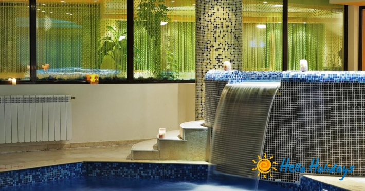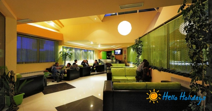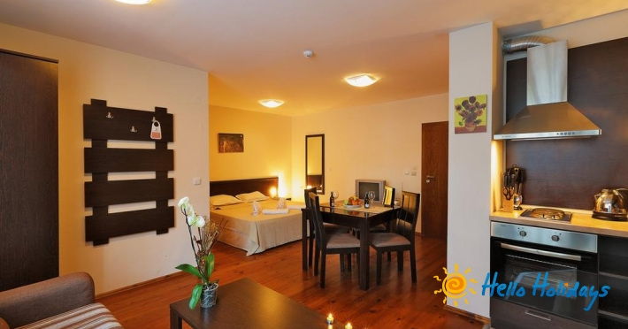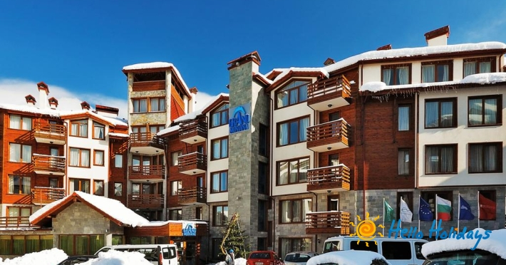 Hotelul are vedere la piscurile înzăpezite ale Munților Pirin și la pârtiile albe ale centrului de schi modern.