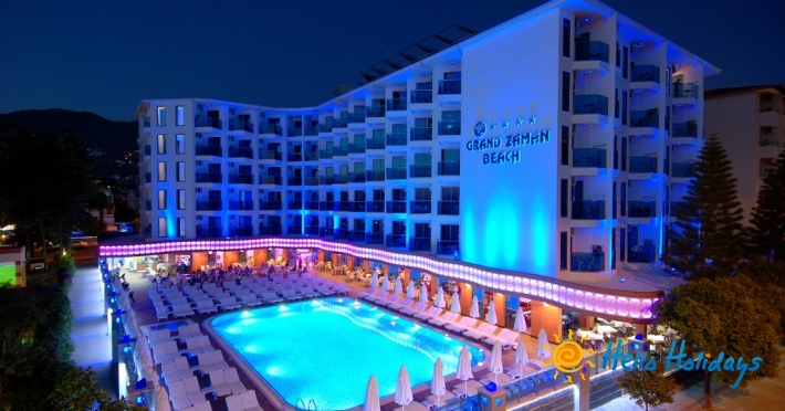 Hotelul Grand Zaman Beach, renovat în 2012, se află vizavi de plaja Cleopatra, în centrul stațiunii turcești Alanya. Magazine, o stație de autobuz, baruri și restaurante sunt la 100 de metri. Wi-Fi este disponibil gratuit, iar hotelul are o cameră cu TV, o grădină, un salon de coafură și un minimarket. Hotelul oferă o piscină pentru copii şi una pentru adulţi, un bar la piscină, o saună, o baie turcească și un hamam. Șezlonguri și umbrele de soare sunt disponibile, iar facilități de biliard, un internet café și servicii de masaj sunt oferite la un cost suplimentar. Grand Zaman oferă cazare all inclusive, cu mic dejun, prânz, cină și băuturi locale. Restaurantul principal servește preparate din bucătăria modernă turcească și franceză, cu opțiuni vegetariene și un meniu pentru copii. Băuturi și gustări sunt disponibile la restaurantul à la carte și la baruri.