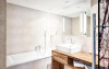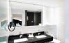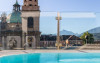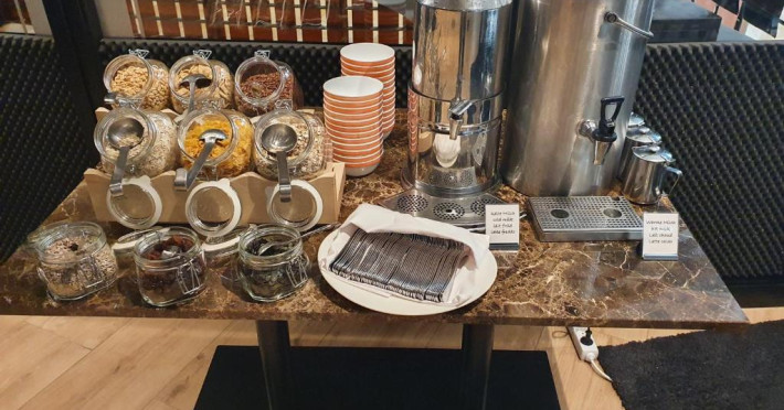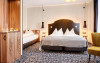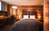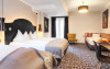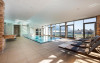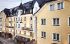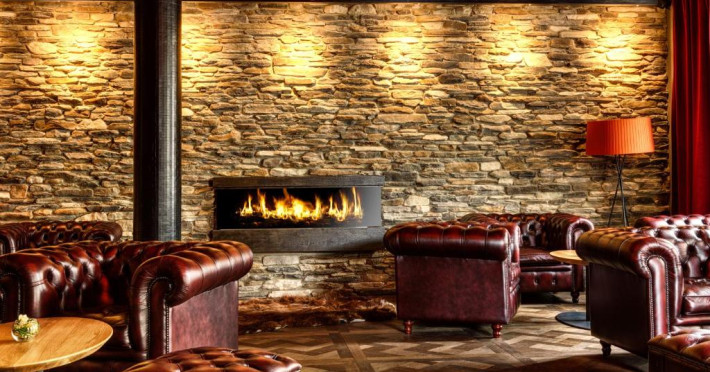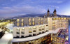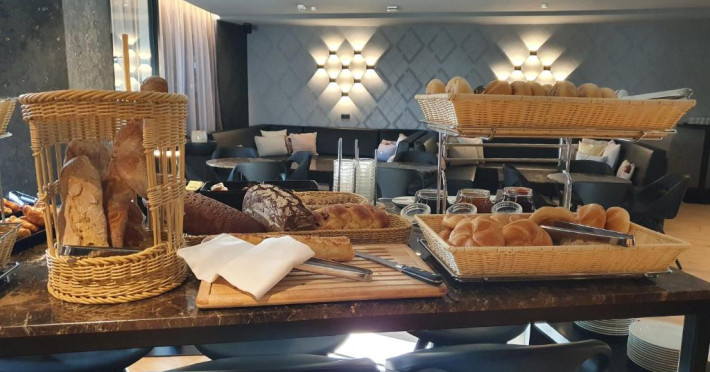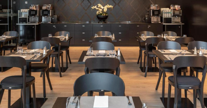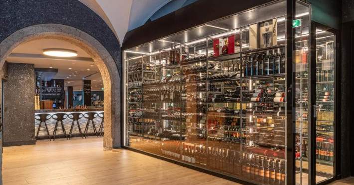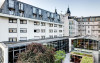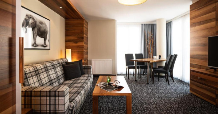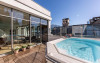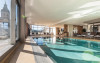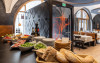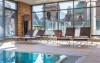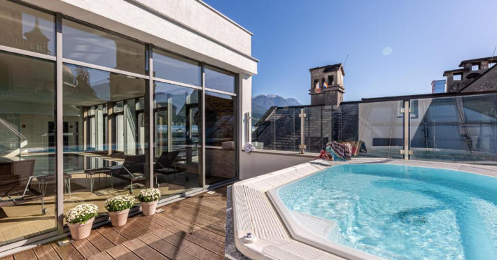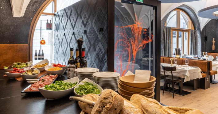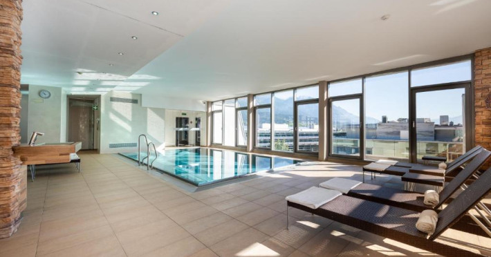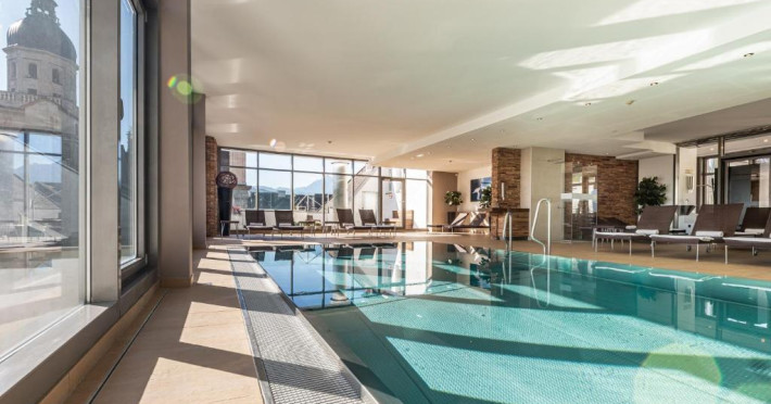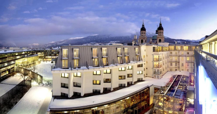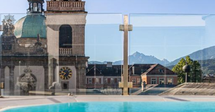 Sala de mic dejun și zona de spa a Hotelului Grauer Bär au vedere panoramică la acoperișurile din Innsbruck și la peisajul montan tirolez.