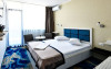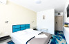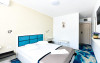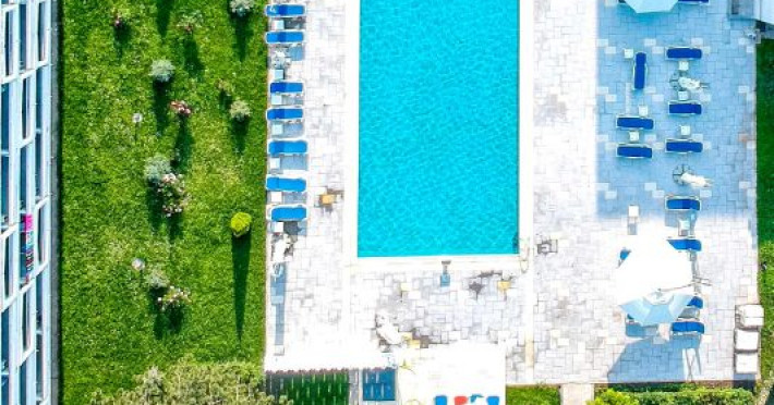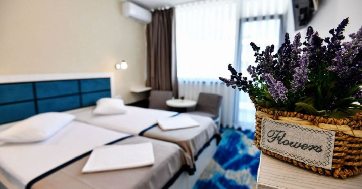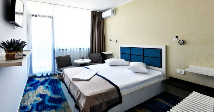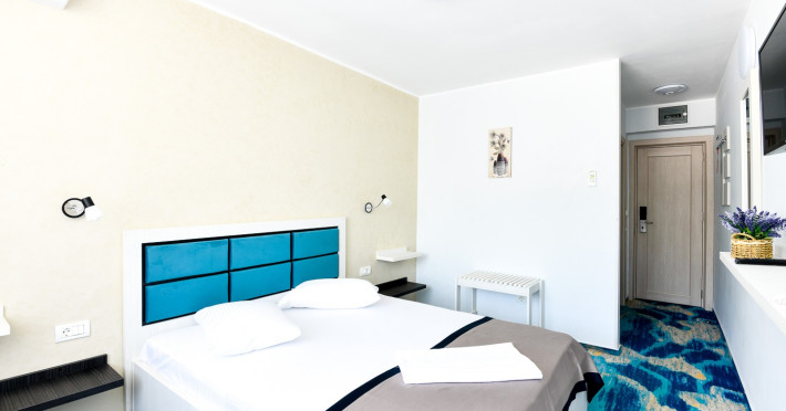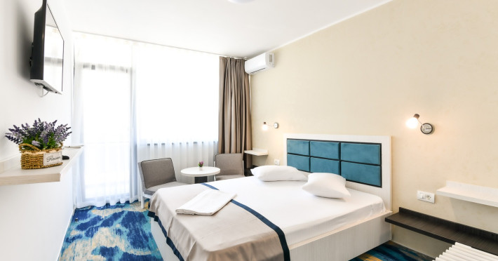 Hotelul Holiday Blue este situat in statiunea Olimp, la aproximativ 195 de metri de plaja, oferind o locatie convenabila pentru turisti. Hotelul a fost complet renovat si modernizat in perioada 2019-2020, asigurand conditii moderne si confortabile de cazare. Hotelul dispune de 226 de camere duble, repartizate in doua corpuri de cladire cu cate 4 etaje fiecare. Camerele sunt dotate cu aer conditionat, televizor LCD, frigider, internet wireless gratuit si baie proprie cu dus. Camerele de la etaj beneficiaza si de balcon, oferind oaspetilor un plus de confort. Printre facilitatile oferite se numara o piscina in aer liber, acces gratuit la internet wireless in zonele publice, bar de zi si parcare proprie gratuita, in limita locurilor disponibile. Serviciile de masa sunt asigurate la restaurant in sistem bufet suedez. Hotelul este potrivit atat pentru cupluri, cat si pentru familii cu copii, oferind facilitati adecvate pentru o vacanta relaxanta la malul marii.