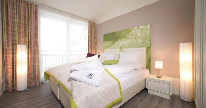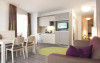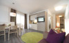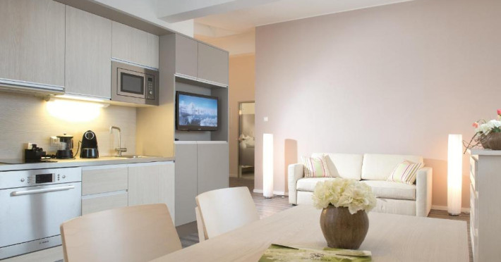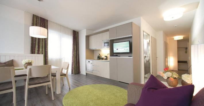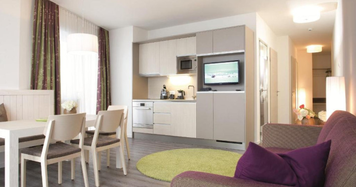 The modern rooms and apartments feature a flat-screen satellite TV and a bathroom. Apartments also include a kitchen with a dining area.