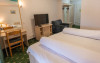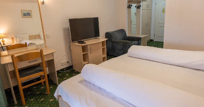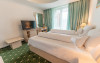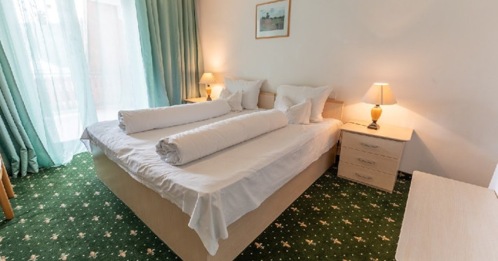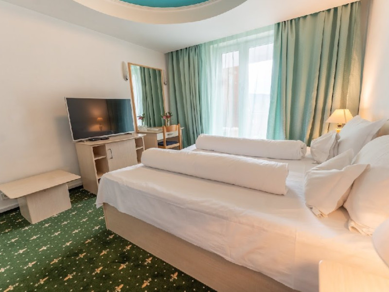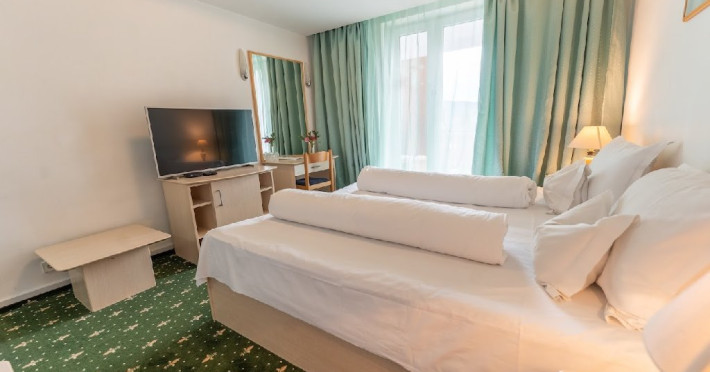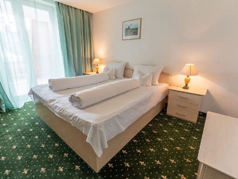 DESCRIERE CAMERE: Camerele duble au pat matrimonial sau paturi twin, minibar, mocheta, tv, baie proprie cu cabina de dus si uscator de par. Apartamentele 4 locuri au incluse 4 mic dejunuri, sunt formate din living si dormitor.