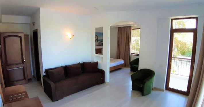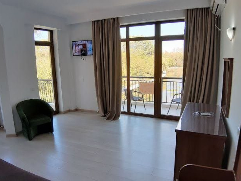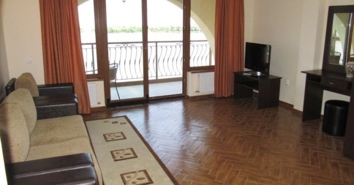 Junior suite 4*: pat matrimonial si canapea extensibila, vedere partiala spre lac si parc, capacitate maxima 4 adulti si 1 copil 0- 4 ani