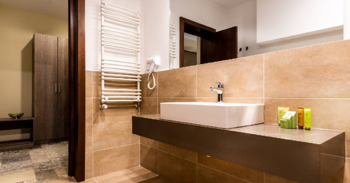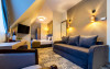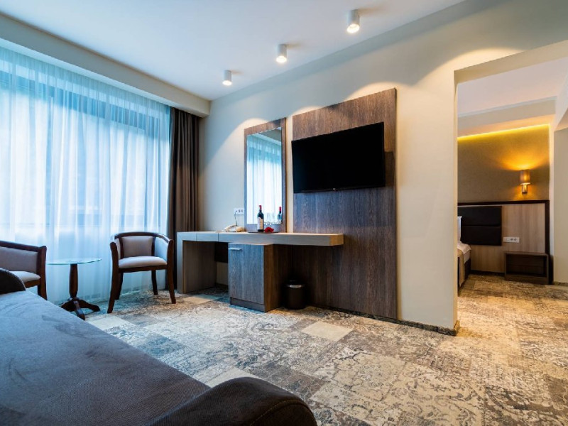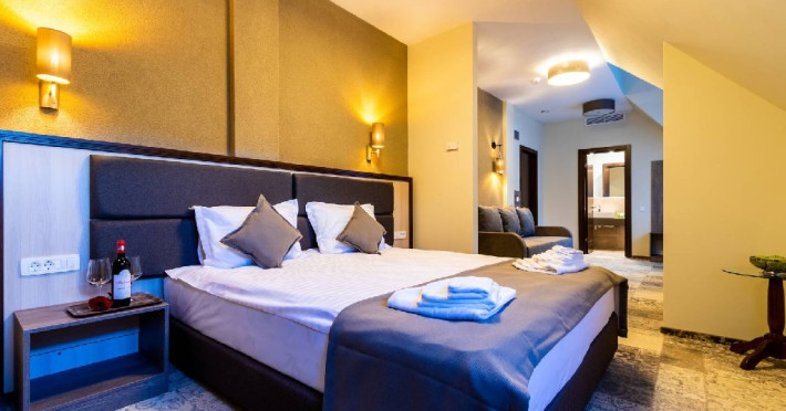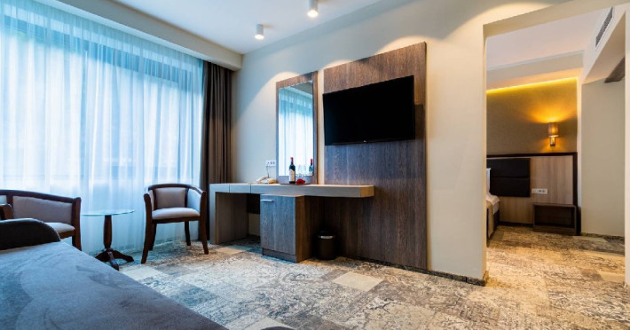 Apartamentul Junior Suite este dotat cu o camera cu pat matrimonial, un living cu canapea extensibila,usa despartitoare intre cele doua camere, baie cu cada, fara balcon, cu o suprafata de 42 mp. Acest tip de camere acomodeaza maxim 4 adulti sau 2 adulti si 1-2 copil mai mici 14 ani.