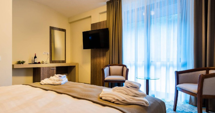Apartamentul Romantic Suite este open space, dotat cu o camera cu pat matrimonial, un living cu canapea extensibila, fara balcon, cu o suprafata de 29 mp. Acest tip de camere acomodeaza maxim 3 adulti sau 2 adulti si 1-2 copil mai mici 14 ani.