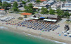 Plaja publica cu nisip la aproximativ 150 m, amenajata cu umbrele si sezlonguri.