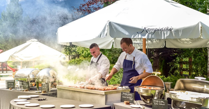 La Kempinski Hotel Grand Arena oaspeții au la dispoziție 3 restaurante unde pot savura mâncăruri delicioase, în stil bufet sau à la carte. Bucătăria mediteraneană de la Kempinski Hotel Grand Arena propune preparate delicioase care satisfac gusturi diverse. Masa poate fi servită atât în interior, cît si în aer liber, pe terasă, în funcție de vreme. 5 baruri sunt disponibile cu o ofertă variată de băuturi răcoritoare și alcoolice. În cadrul proprietății există și un snack bar care servește băuturi și gustări.