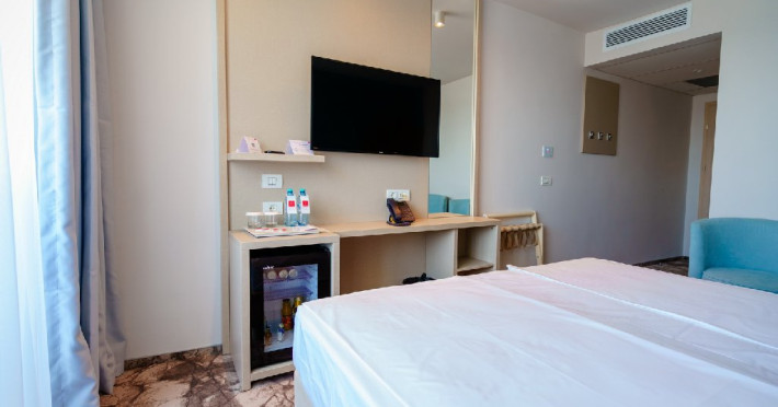 Dotari camera: wi-fi, sistem de climatizare, tv cu ecran plat, telefon, minibar, seif, apa plata, bomboane ciocolata, papuci, articole de baie (casca baie, sapun, gel de dus, sampon, lotiune de corp), uscator de par, baie cu cabina de dus, oglinda barbierit/machiaj, canapea extensibila, birou, balcon