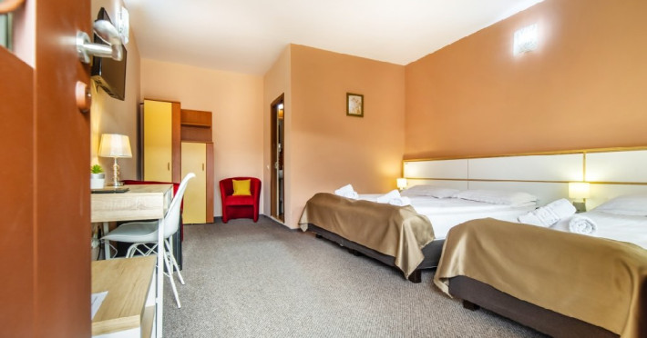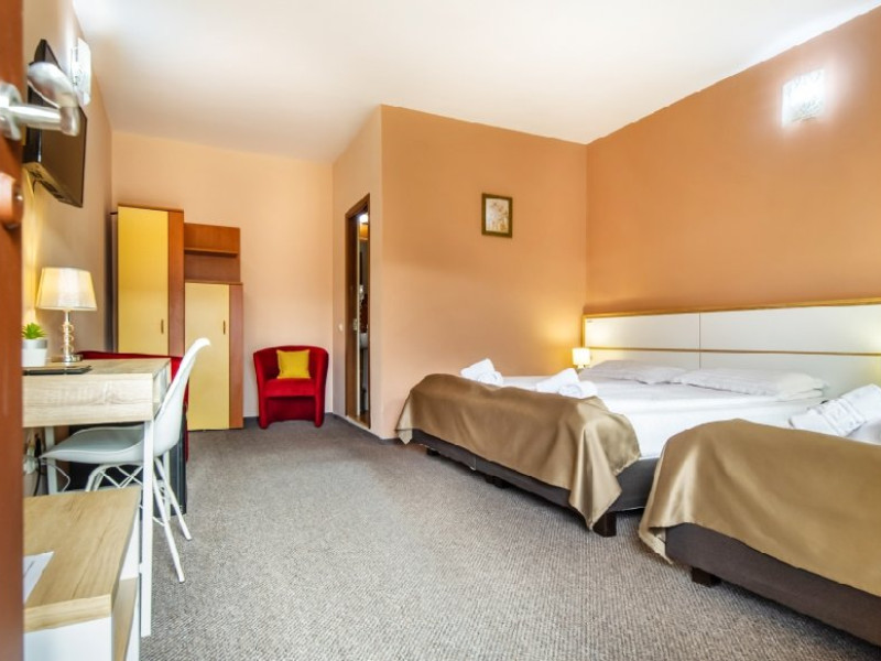 - Camera Tripla- pat matrimonial 180/200 si pat single 90/200- capacitate max 3 pers. Ideale pentru o familie de 3 persoane, majoritatea camerelor triple de la Hotelul Long Street au o priveliste de vis catre Tampa. Toate camerele au geamuri duble, asigurand un mediu linistit si relaxant. Camerele triple au un pat dublu (180 cm) si un pat de 1 persoana (90 cm), baie proprie cu cabina de dus.