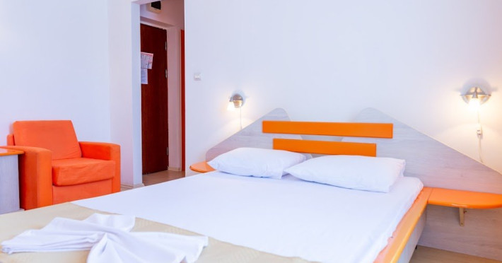 Camera dubla cuprinde spatiu de dormit cu o suprafata de 14 mp (cu pat matrimonial sau paturi twin).