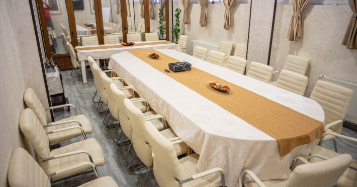 Sala de conferinta, capacitate de 30 locuri. Dotari: videoproiector, ecran proiectie, flipchart, laptop, consumabile, internet wireless, acces copiator, lumina naturala partiala. Dimensiuni sala: 12 m lungime, 4 m latime, 2.5 m inaltime.