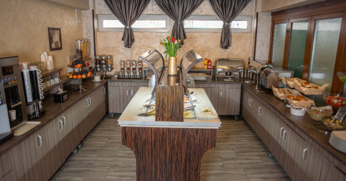 Se acorda in restaurantul hotelului in sistem fisa cont. De la orele 8:00 la orele 11:00 se serveste micul dejun in regim bufet suedez iar incepand cu orele 13:30 pana la orele 22:00 se pot servi si celelalte mese in regim a la carte dintr-un meniu romanesc.