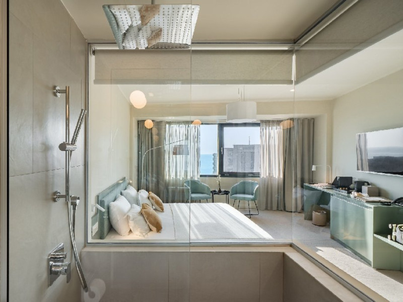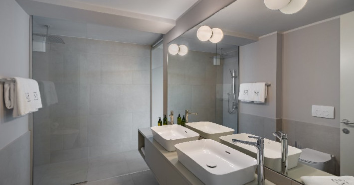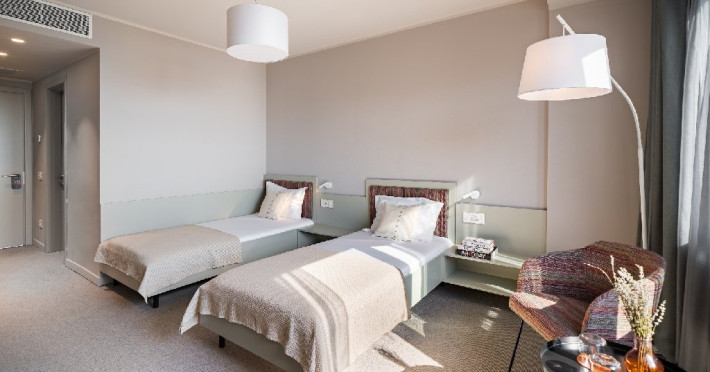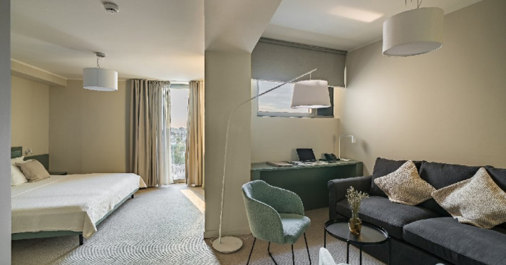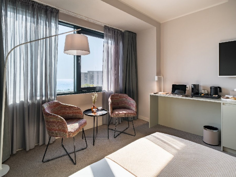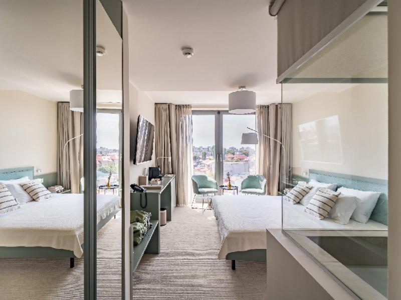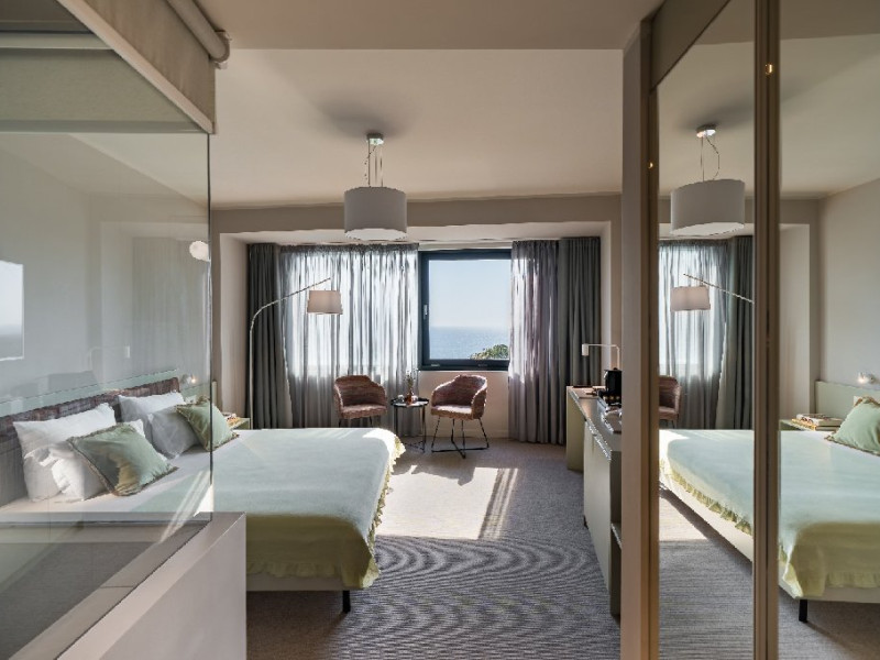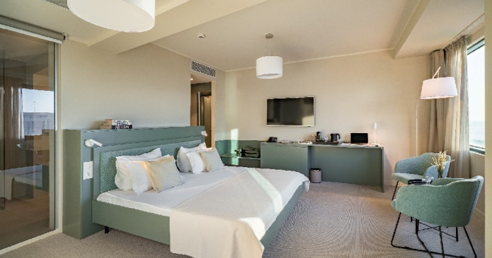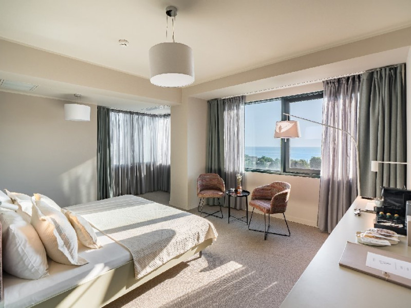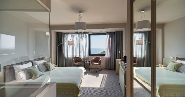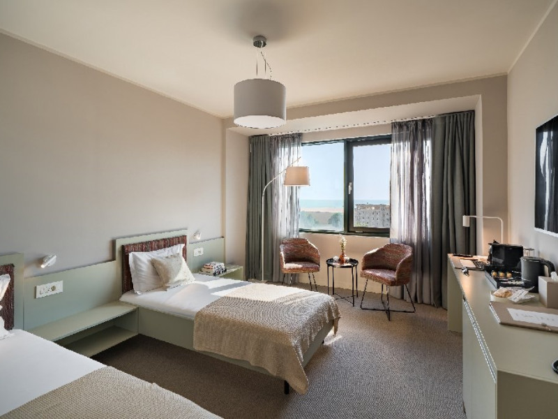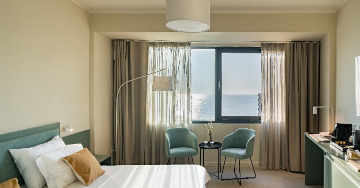 Camera cu 2 paturi, priveliste la mare, suprafata de 24mp, minibar, baie cu cada.
