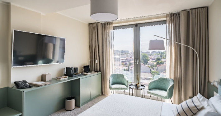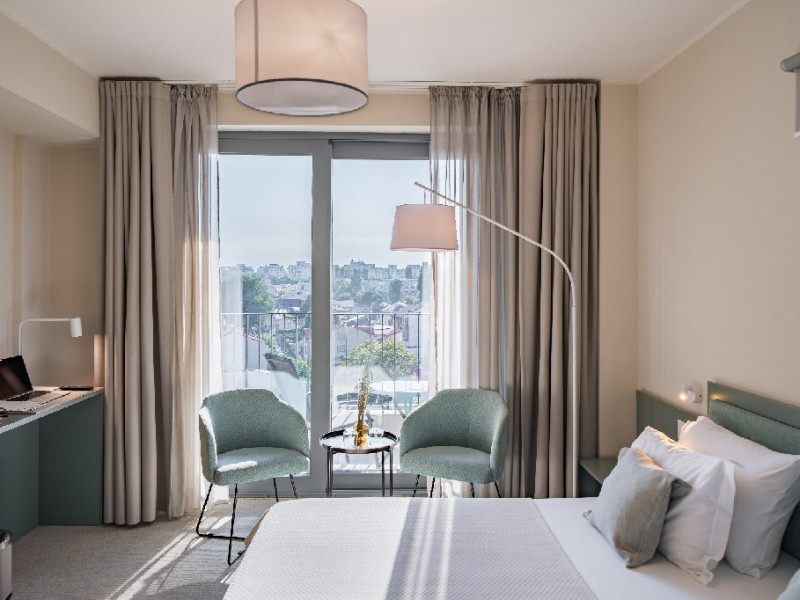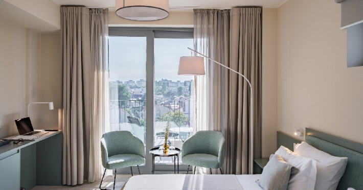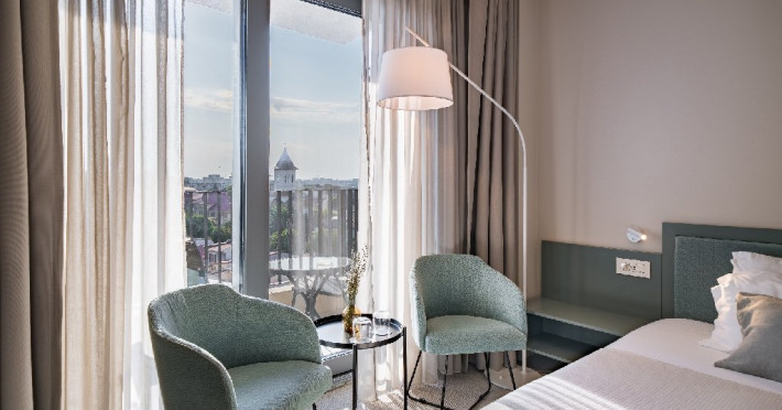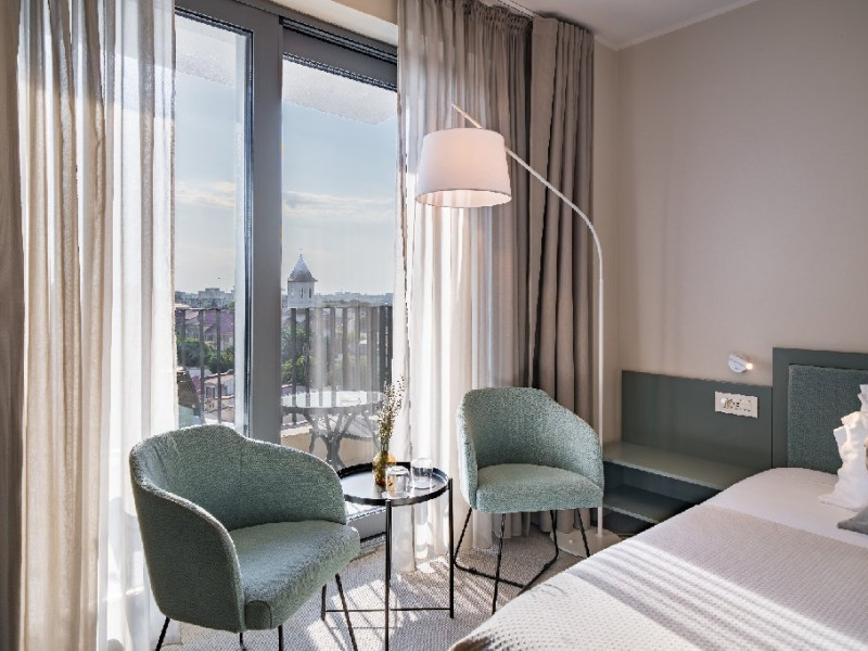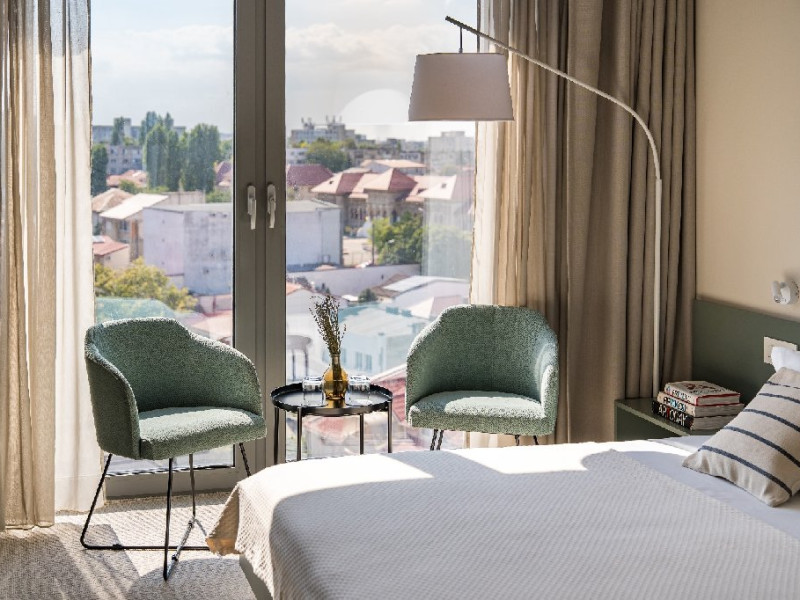 Camere cu priveliste la oras, suprafata de 32mp, pat king size si canapea extensibila, baie cu cada.