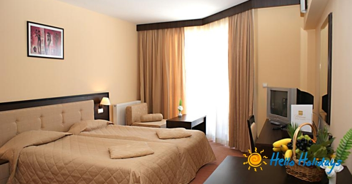 Toate cele 175 de camere au: baie cu cada, uscator de par, balcon mobilat, aer conditionat, mini bar, telefon, TV satelit cu canale radio, seif, acces gratuit la internet WIFI, facilitati pentru prepararea ceaiului si a cafelei (la solicitare, contra cost). Repetitorii si tinerii casatoriti primesc fructe proaspete si vin la sosire. Camerele Twin cu vedere laterala spre mare au 23 mp si capacitatea maxima de 3 persoane. Camerele Family au 23 mp si capacitatea maxima de 2 adulti si 2 copii, avand un pat matrimonial si 2 paturi supraetajate. Camerele Superior au 23 mp si au in plus halate si papuci si, gratuit, facilitati pentru prepararea ceaiului si a cafelei, capacitatea maxima fiind de 3 persoane. Camerele cu vedere directa spre mare si gradina au 24 mp, au in plus fata de Superior 2 balcoane mobilate, capacitatea maxima fiind de 3 persoane. Camerele Mini Suite cu Jacuzzi comun au 27 mp, balcon si gradina cu platforma de lemn, facilitati pentru prepararea ceaiului si a cafelei (gratuit), fructe proapsete si vin la sosire, zona de living cu masuta si fotolii, sezlonguri, masa si scaune (in exterior), jacuzzi comun, halate si papuci. Capacitatea maxima este de 3 adulti sau 2 adulti si 2 copii.