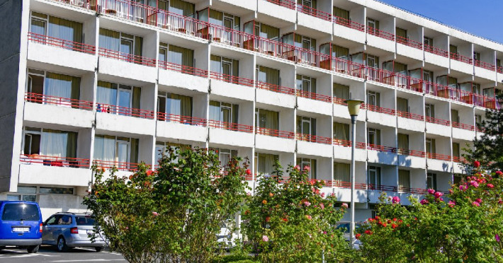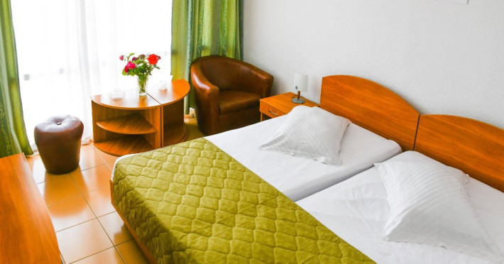 - 23 camere duble la parter, fara balcon.Camerele pentru persoane cu dizabilitati sunt situate la parter, dispun de un spatiu generos, sunt prevazute cu usi de dimensiuni mari, special amenajate pentru accesul cu carucior.