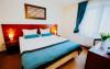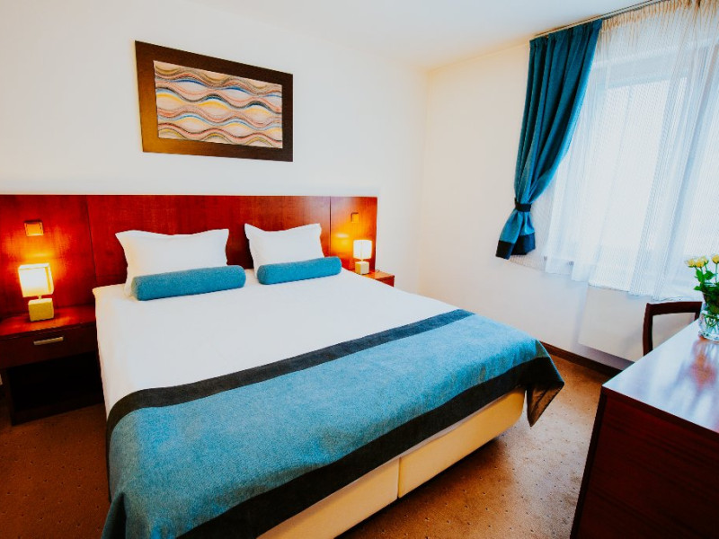 Camerele duble au aprox 20 mp si sunt dotate cu pat matrimonial (160x200) sau twin cu saltea ortopedica, mocheta, unele camere au balcon, aer conditionat, Tv, Wi-fi, telefon, seif, minibar cu produse, baia este dotata cu cabina de dus, uscator de par, halate de baie si papuci de camera, cosmetice baie.