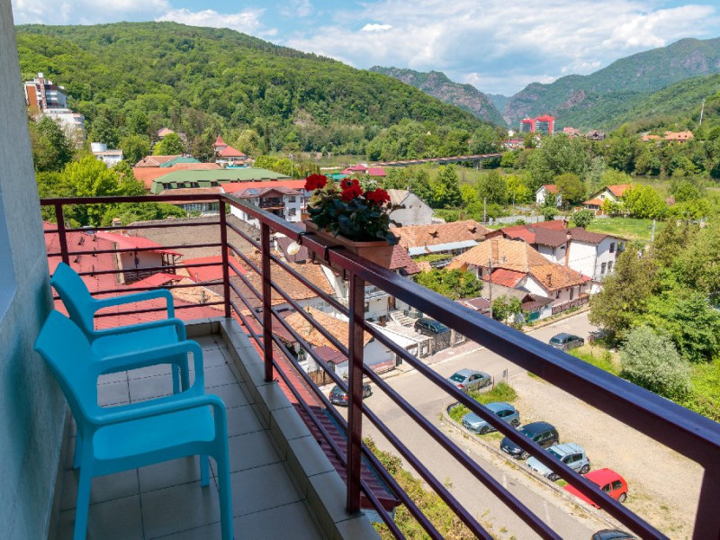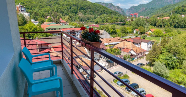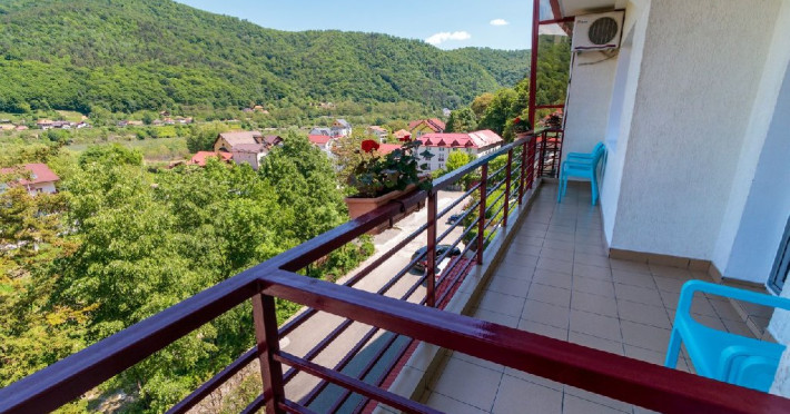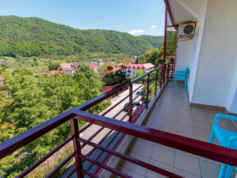 Camerele matrimoniale si camerele twin fara balcon au vedere spre padure, in timp de camerele cu balcon au vedere spre muntele Cozia si panorama asupra Vaii Oltului.
