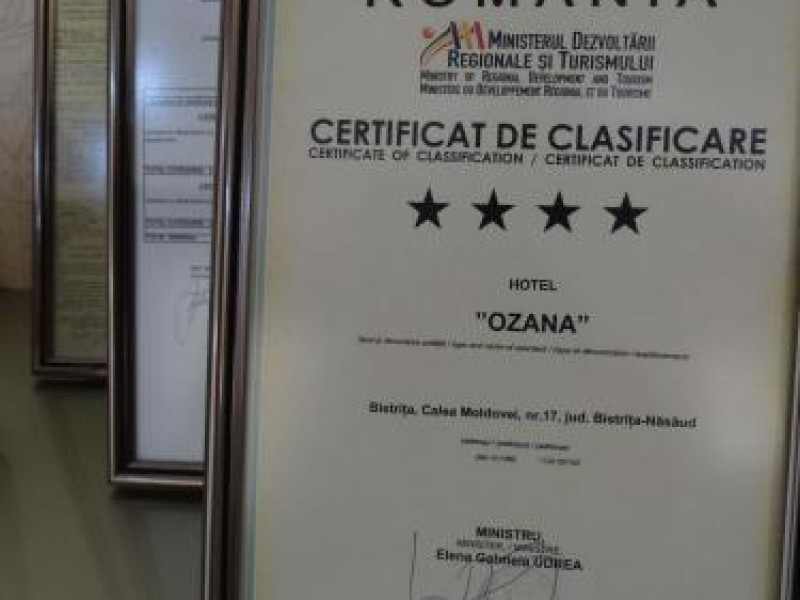 Want to take a rest and explore the city? Hotel Hotel Ozana is located in Bistrita. This hotel is located in walking distance from the city center.Want to take a rest and explore the city? Hotel Hotel Ozana is located in Bistrita. This hotel is located in walking distance from the city center.You can stop by the bar. Its time to have a nice meal! Stop by the restaurant. The hotel cafe is a nice place to have a snack. Free Wi-Fi on the territory will help you to stay on-line.If you travel by car, you can park in a parking zone. For business meetings, there is a conference hall and meeting and presentation facilities. If you want to make your journey even more comfortable, you can order a transfer. Accessible for guests with disabilities: the elevator helps them to go to the highest floors.At the guests disposal, theres also a laundry, dry cleaning, private check-in and check-out, ironing, a safe-deposit box and a concierge. The staff of the hotel speaks English, Spanish, Italian, German and French.You can stop by the bar. Its time to have a nice meal! Stop by the restaurant. The hotel cafe is a nice place to have a snack. Free Wi-Fi on the territory will help you to stay on-line.If you travel by car, you can park in a parking zone. For business meetings, there is a conference hall and meeting and presentation facilities. If you want to make your journey even more comfortable, you can order a transfer. Accessible for guests with disabilities: the elevator helps them to go to the highest floors.At the guests disposal, theres also a laundry, dry cleaning, private check-in and check-out, ironing, a safe-deposit box and a concierge. The staff of the hotel speaks English, Spanish, Italian, German and French.In the room, there is a TV, a mini-bar, a bathrobe and slippers. The room equipment depends on its category.In the room, there is a TV, a mini-bar, a bathrobe and slippers. The room equipment depends on its category.Guests are required to show a photo identification and credit card upon check-in. Please note that all Special Requests are subject to availability and additional charges may apply.Datorita dinamicitatii domeniului disponibilitatea ofertelor se modifica de la un moment la altul. De aceea ofertele sunt valabile in limita locurilor disponibile. Agentia nu este responsabila pentru eventualele neconcordante care pot aparea intre informatiile privind tarifele si alte detalii din site si informatiile primite in agentie. In aceste cazuri vor avea prioritate, intotdeauna, informatiile primite in agentie.