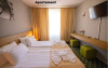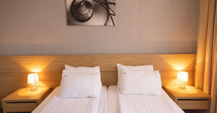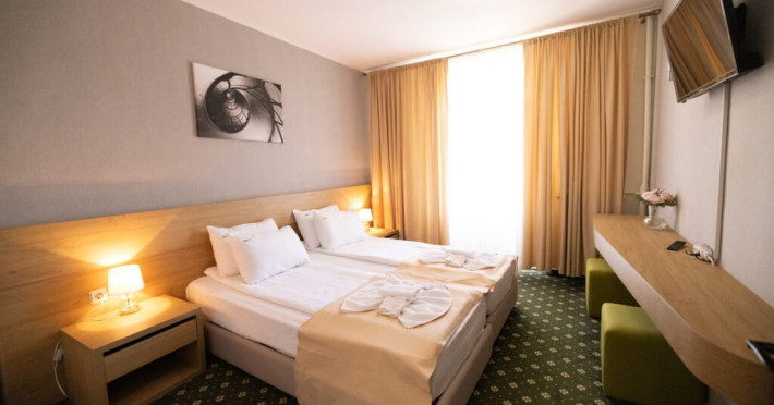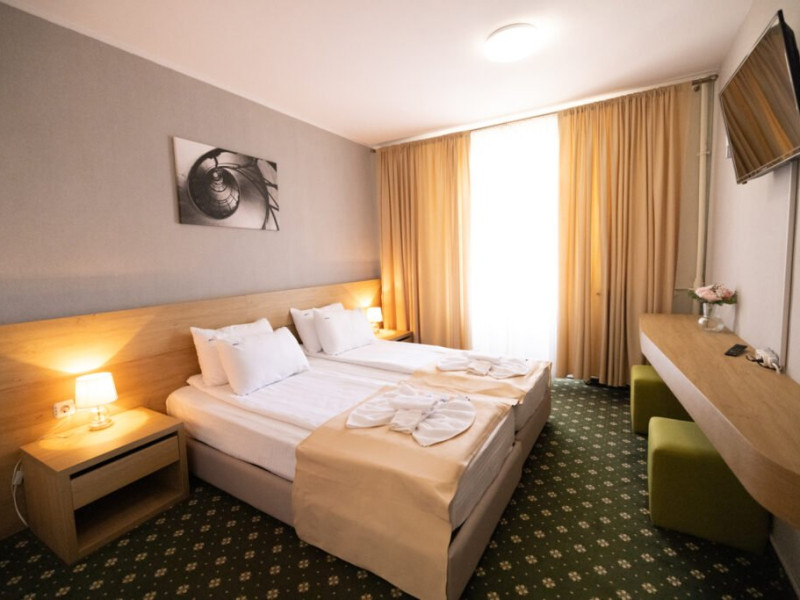 DESCRIERE CAMERE: Camerele duble sunt formate din paturi twin (despartite sau alipite), aer conditionat, mocheta, unele camere au balcon, minibar, tv, fotolii si masuta de cafea. Baia este cu cabina de dus, uscator de par. Fier de calcat disponibil la receptie. Hotelul nu dispune de paturi suplimentare.