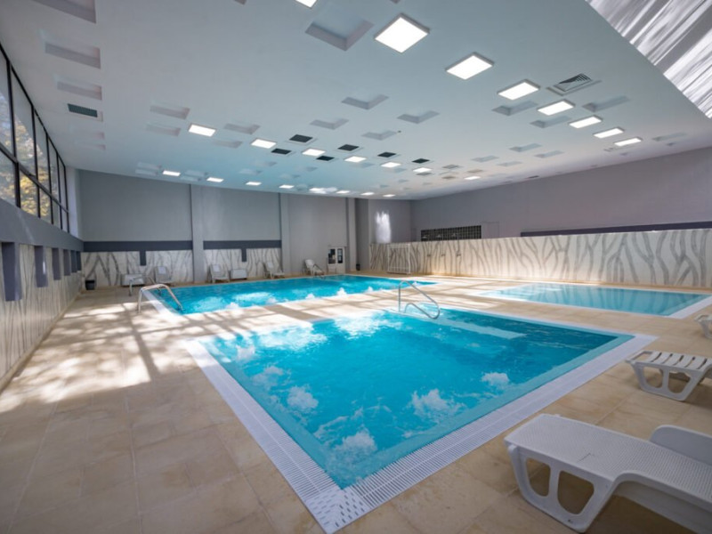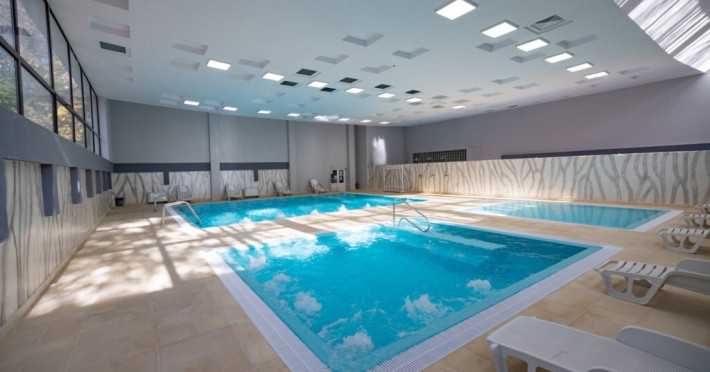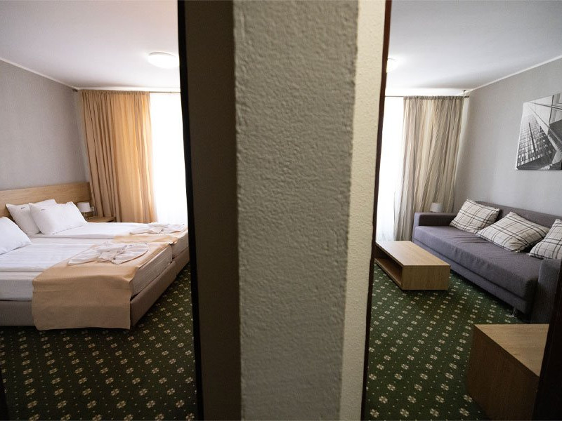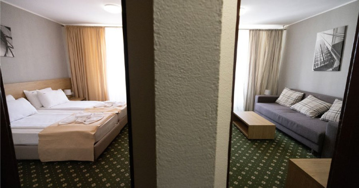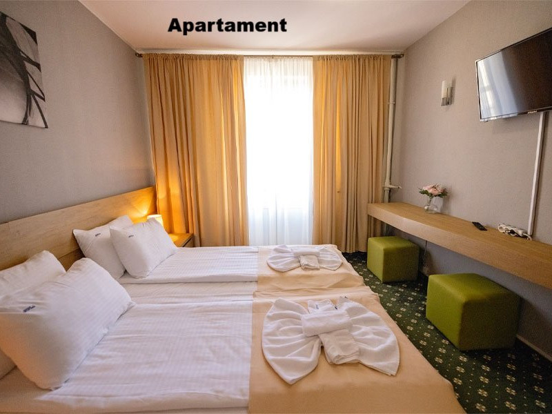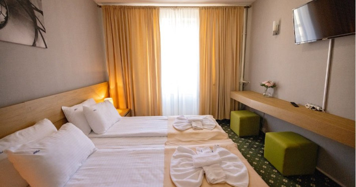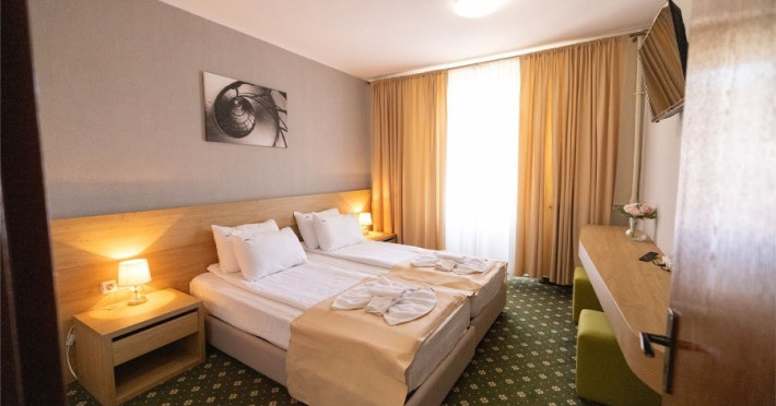 INFORMATII GENERALE: Dispune de 868 de locuri de cazare, impartite in camere single, duble si apartamente.DESCRIERE UNITATE DE CAZARE: Dintre dotari si facilitati mentionam: restaurant, terasa, sali de conferinte, sala de spectacole, sala de evenimente de 500 de locuri, baza de tratament, bazine de interior deschise pentru public in extrasezon, strand in exterior deschis pe perioada sezonului, lift, parcare.