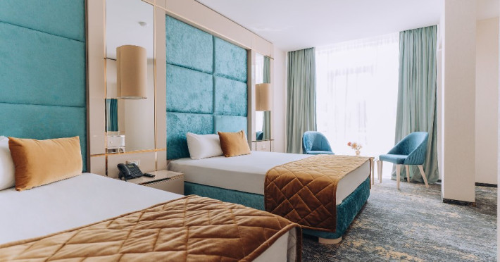 DESCRIERE CAMERE: Camerele de la etajul 1 au balcon, camerele de la etaluj 2 au logie (balcon frantuzesc). Toate camerele sunt matrimoniale. Hotelul nu dispunde pe paturi suplimentare.