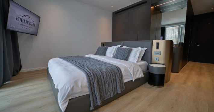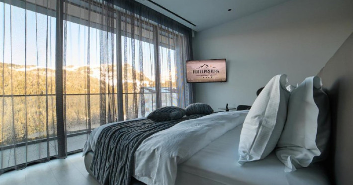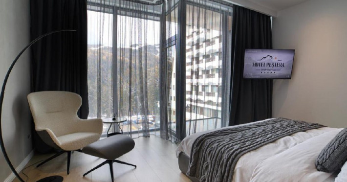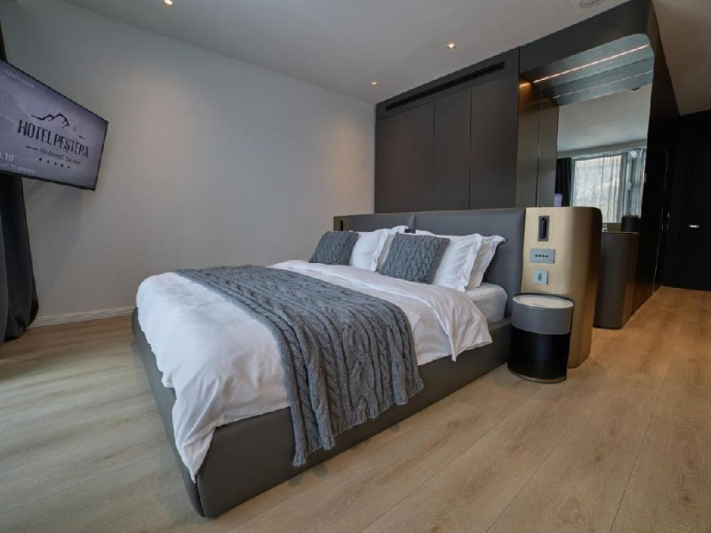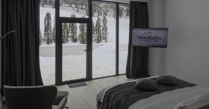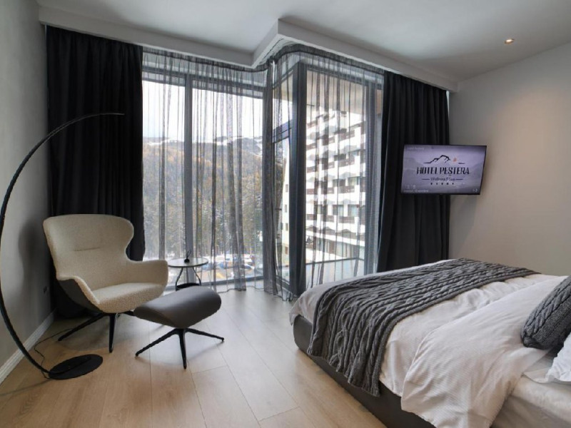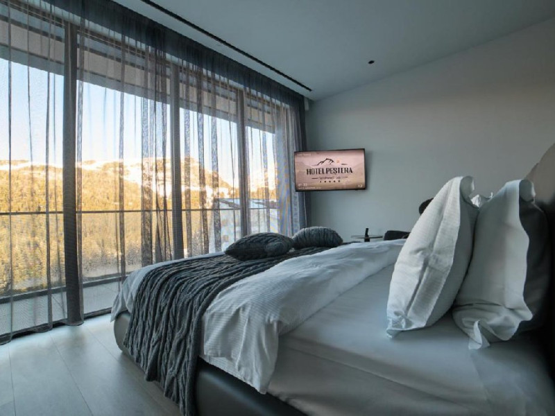 O parte din camere au vedere spre munte, iar celelalte au vedere spre padure. Camerele cu vedere spre padure includ si vedere catre constructia in lucru a noului hotel Pestera 5*.