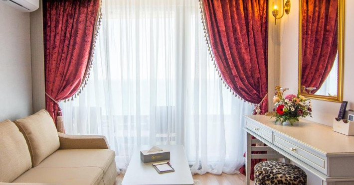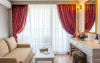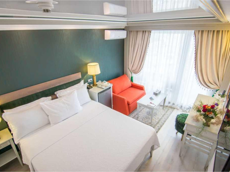 3) - cuprinde un spatiu deschis cu o suprafata de 22-24 mp, zona pentru dormit cu 2 paturi de 110 cm latime, canapea fixa, baie cu dus, balcon individual, mobilier balcon, vedere spre