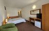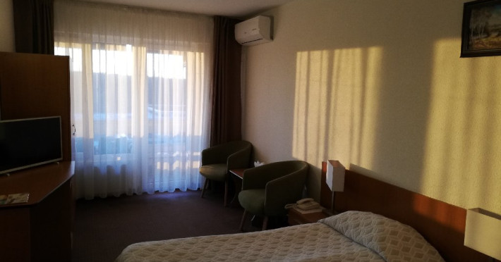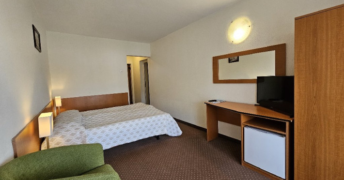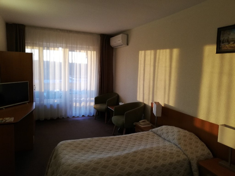 DESCRIERE CAMERE: hotelul dispune de 140 de camere duble, 14 camere single si 4 apartamente. Camerele duble dispun de pat matrimonial sau twin, aer conditionat, balcon, TV, fotolii si masuta de cafea, birou de lucru cu internet Wi-Fi, mocheta, telefon. Baia este dotata cu cada.