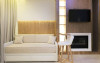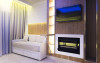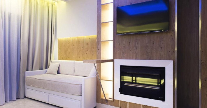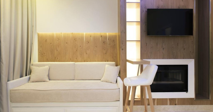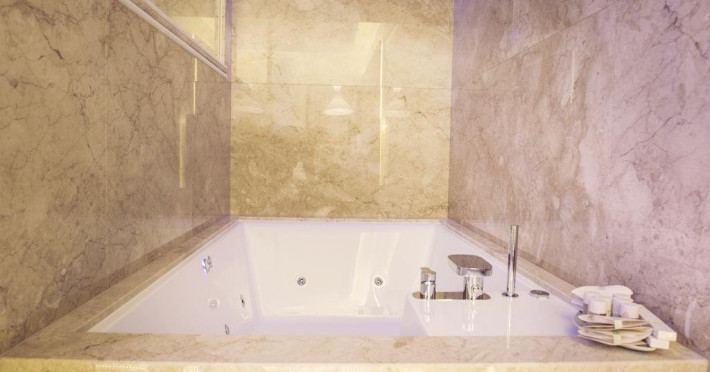 Suita (50 m2) beneficiaza de pat matrimonial si canapea extensibila, semineu si cada cu hidromasaj.