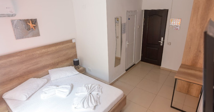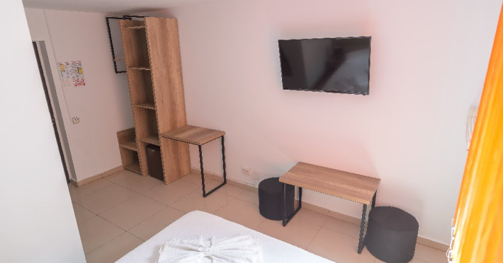 Avem 57 de camere duble, 3 camere maxi si 3 apartamente toate dotate cu aer conditionat, TV, minibar, wi-fi gratuit, pat 160/200 cm, baie cu dus, suport prosop. Apartament de 28m dispune de pat matrimonial 180/200 cm si canapea extensibila.