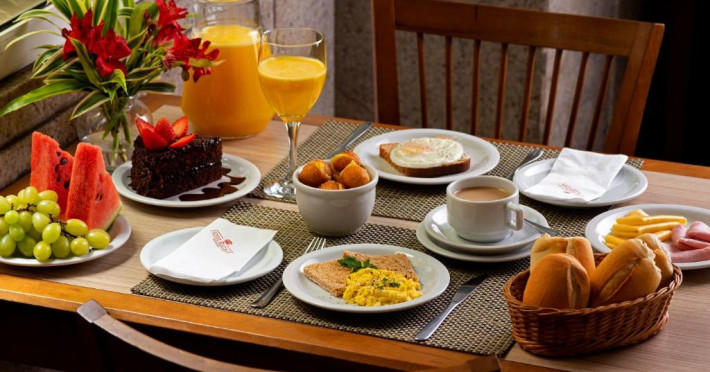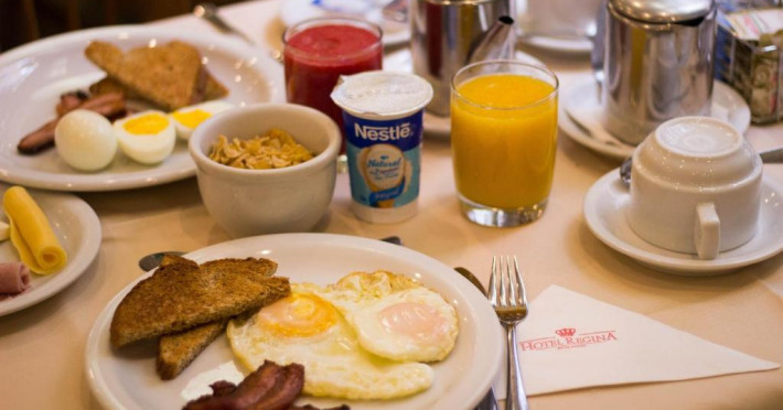 Oferă mic dejun bogat, cu prăjituri și fructe proaspete de sezon. Restaurantul oferă preparate internaționale și este disponibil room service. Oaspeții de la Regina pot folosi o sală de sport modernă și apoi se pot relaxa in saună și cada cu hidromasaj.