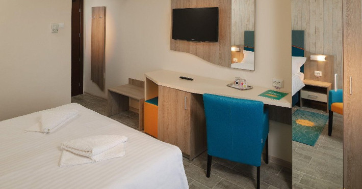 Camera studio- camera dubla cu o suprafata mai generoasa, canapea extensibila 140 cm/200 cm, vedere laterala la mare;